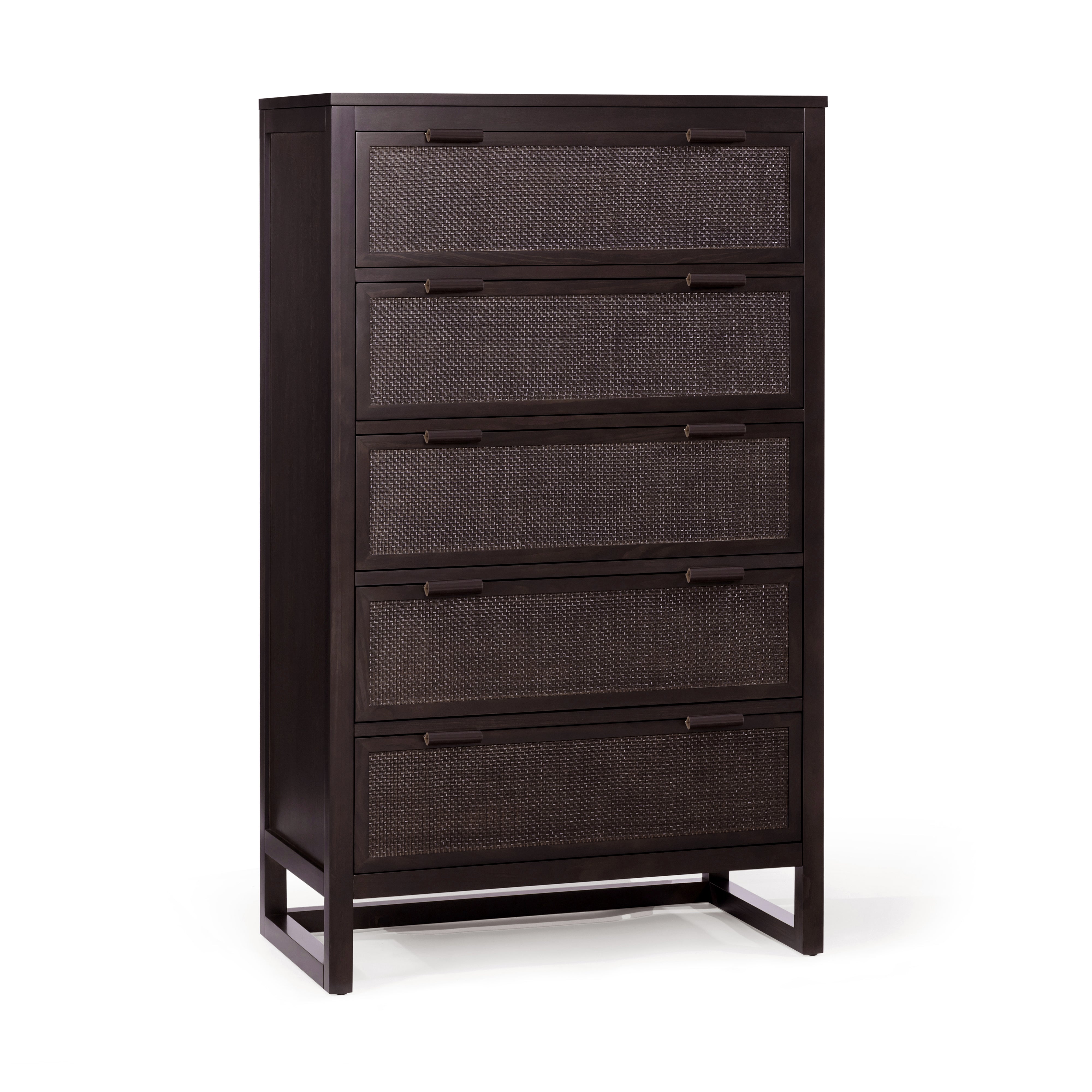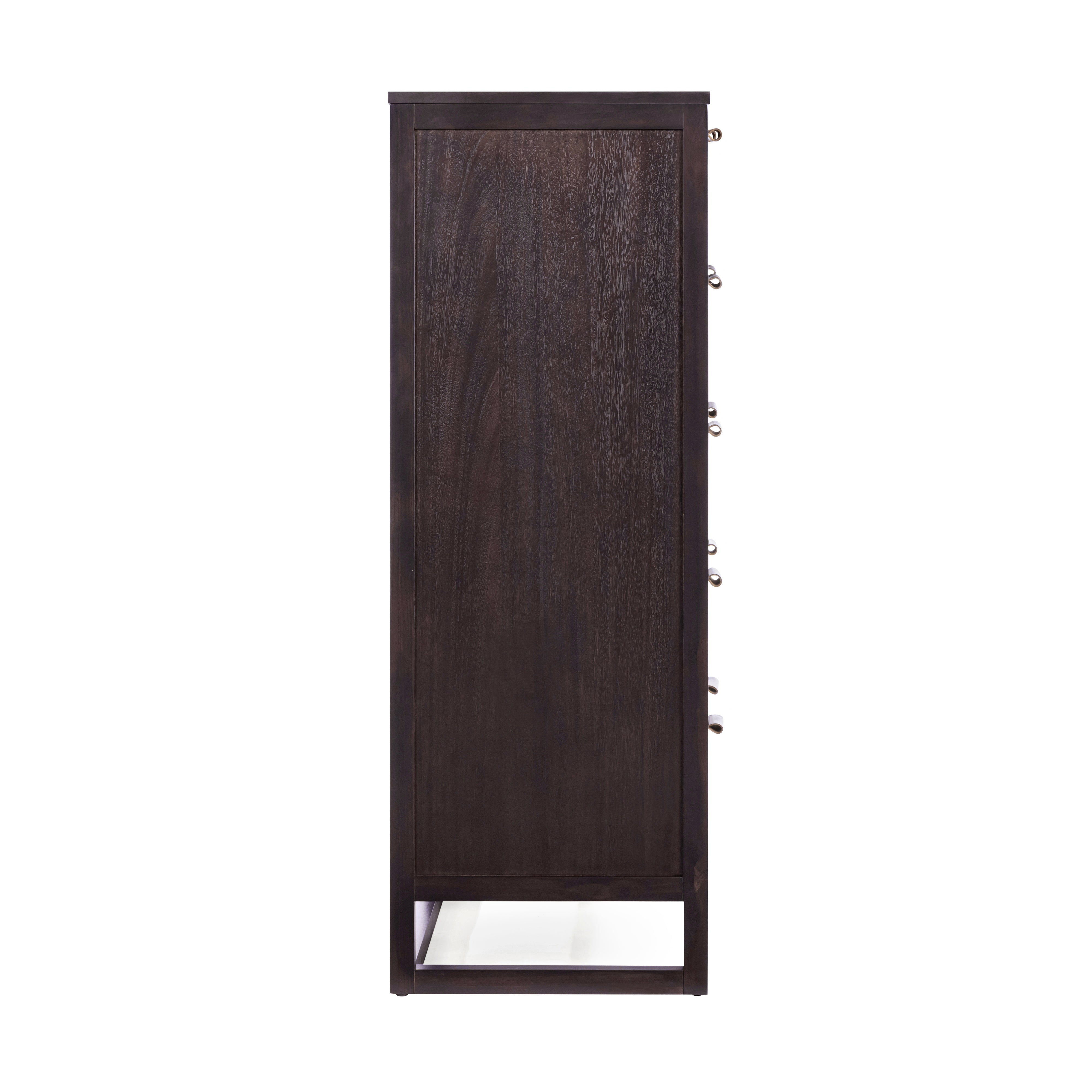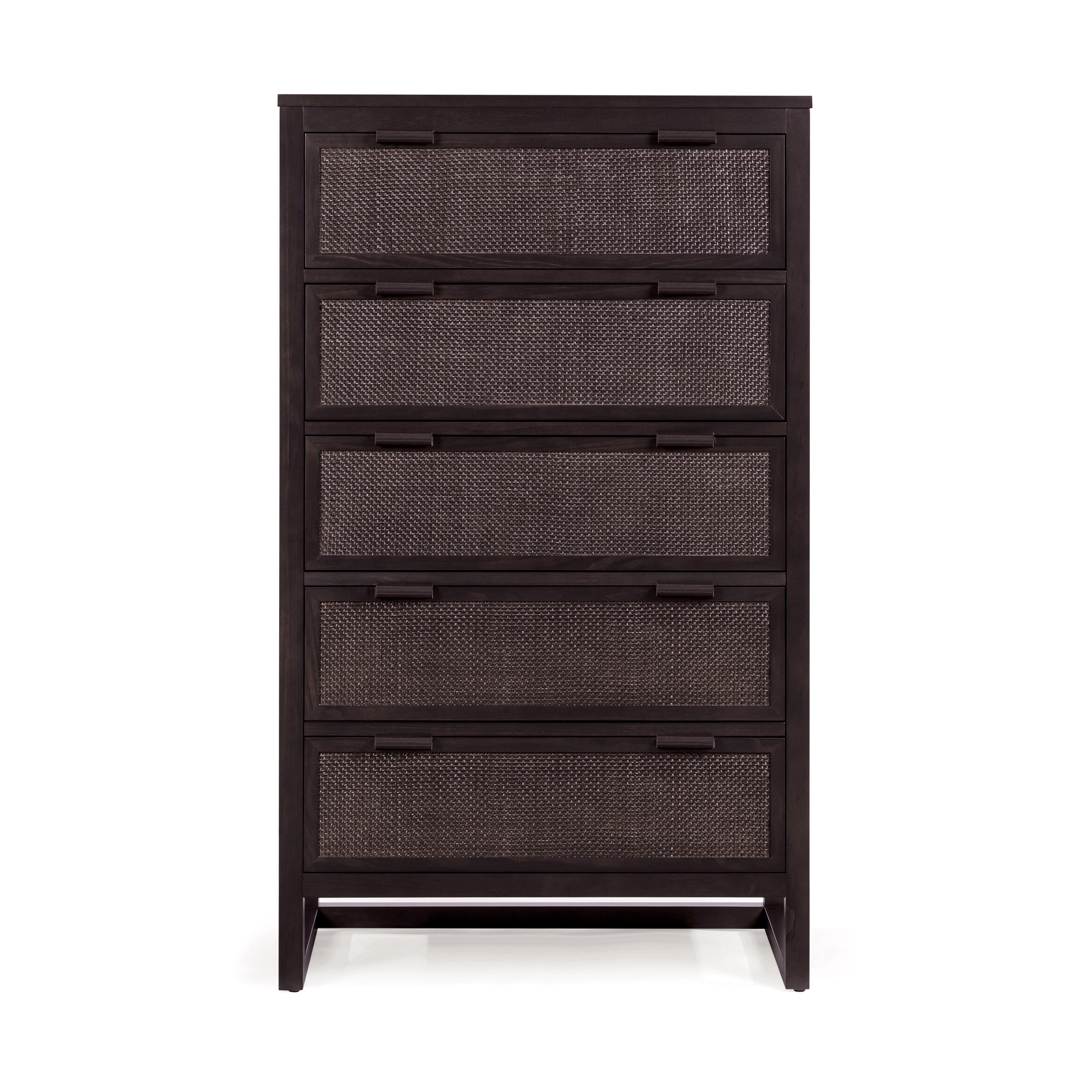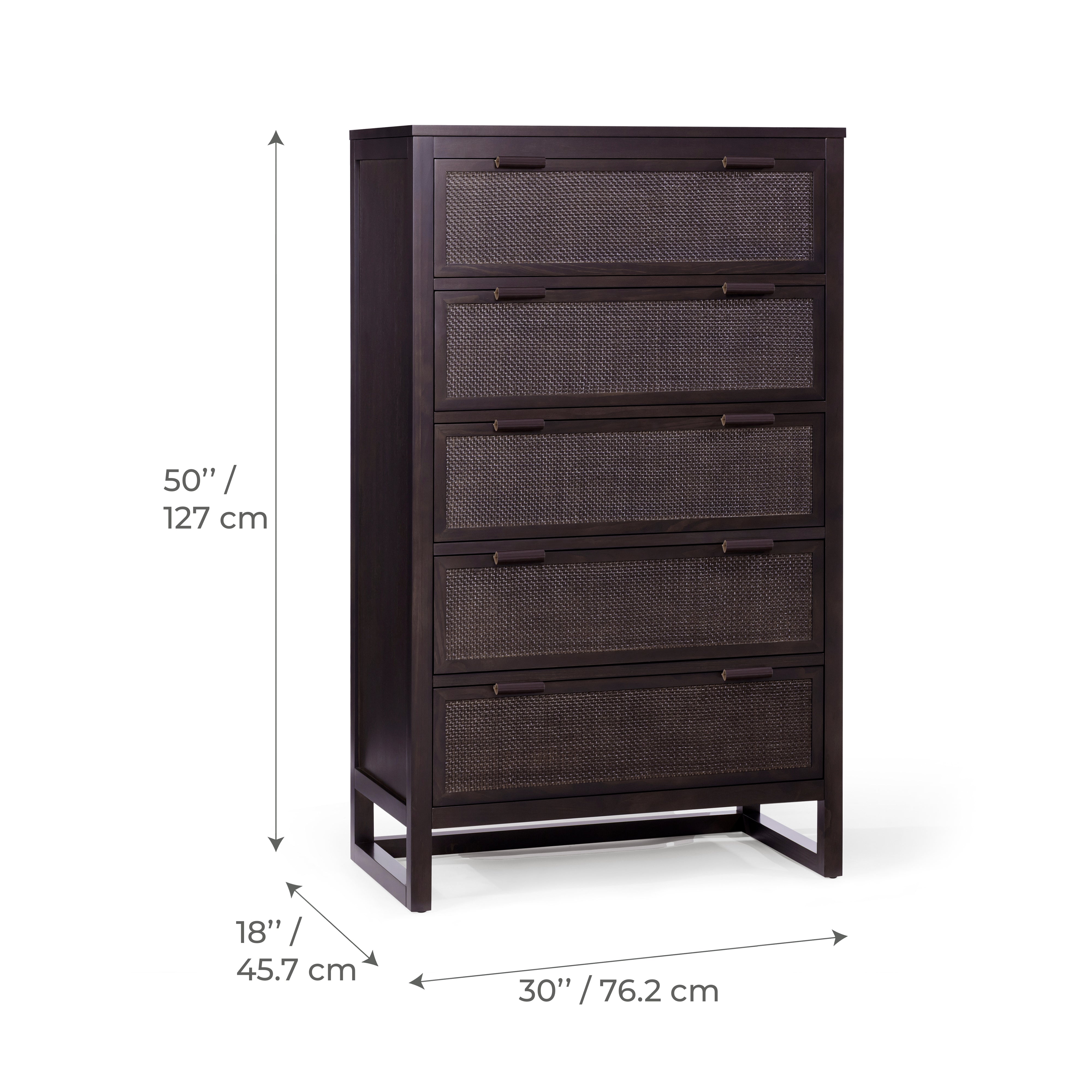 Built from a solid pine wood frame with MDF panels finished in acacia veneer, the dresser provides strength and durability for daily use. Rattan inlay drawer fronts add texture and soften the clean lines, while the mocha brown finish adds warmth. Five drawers provide layered storage for folded clothing, accessories and seasonal items.