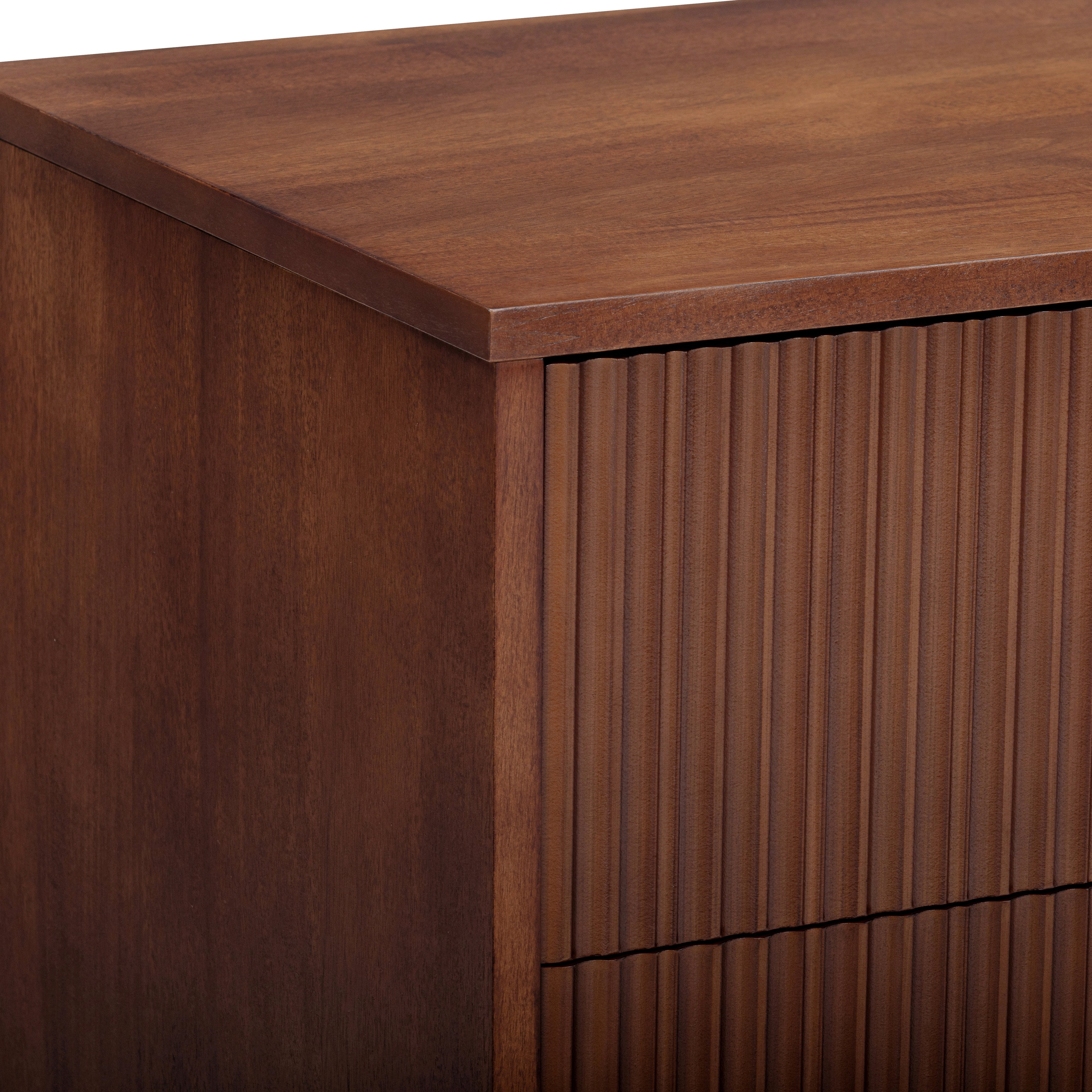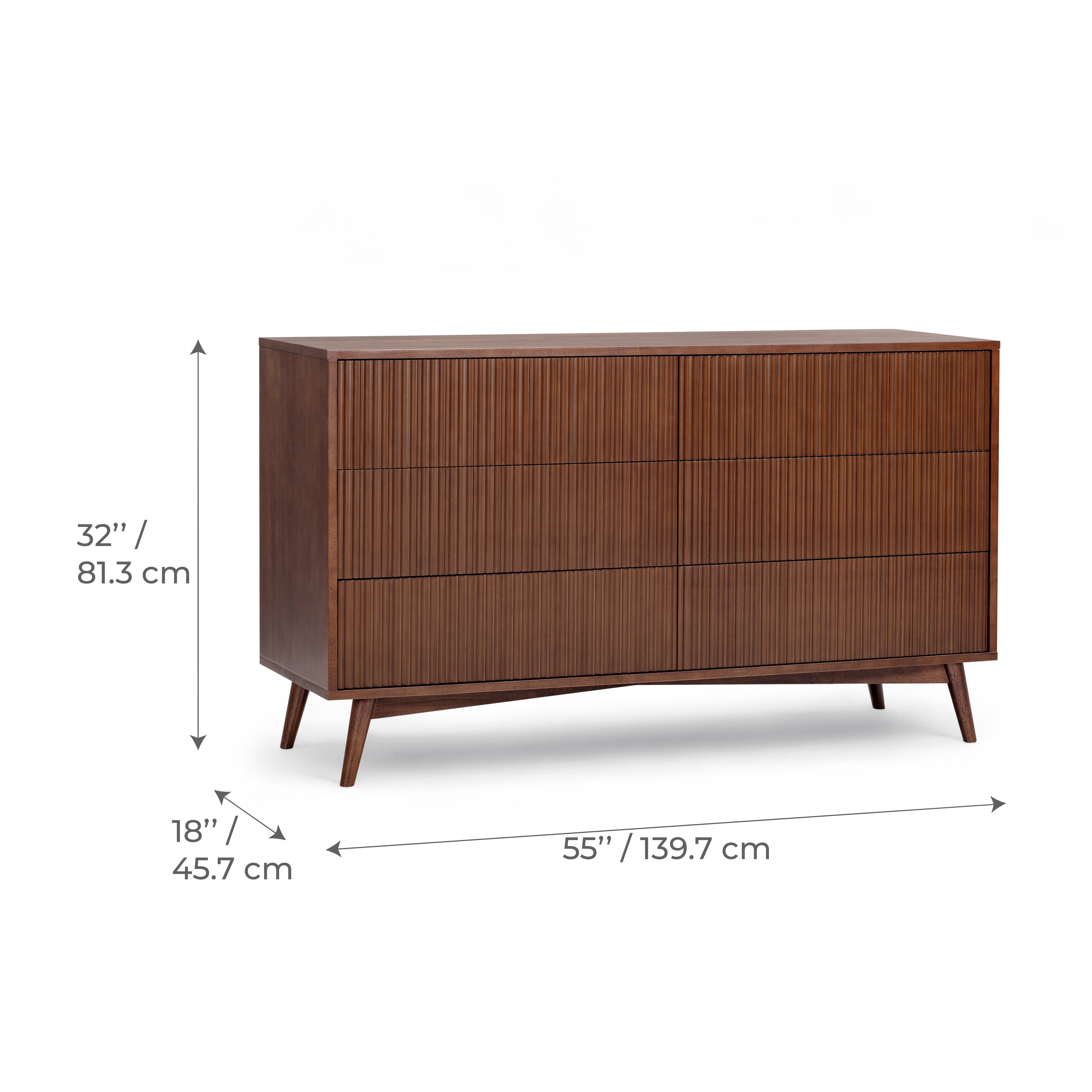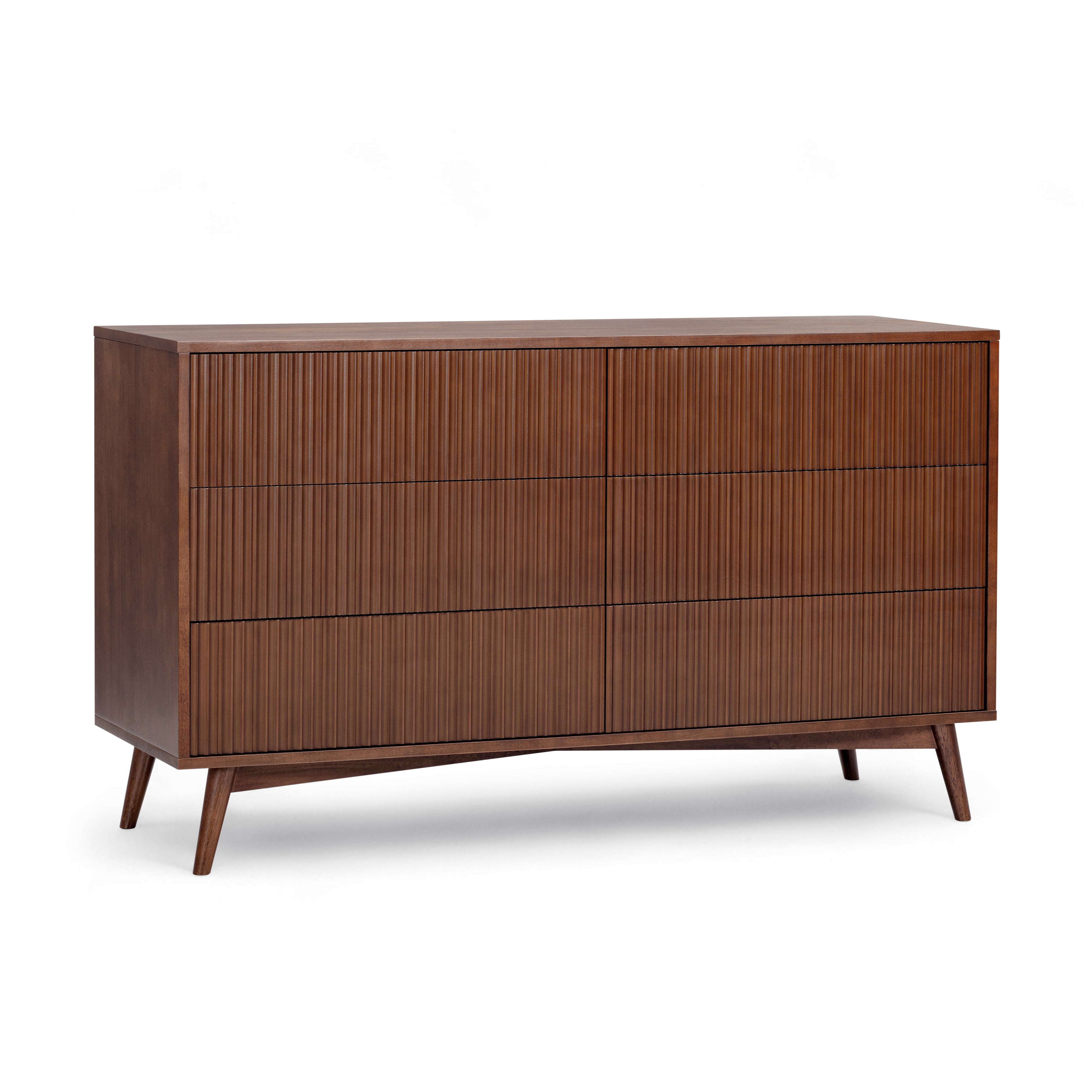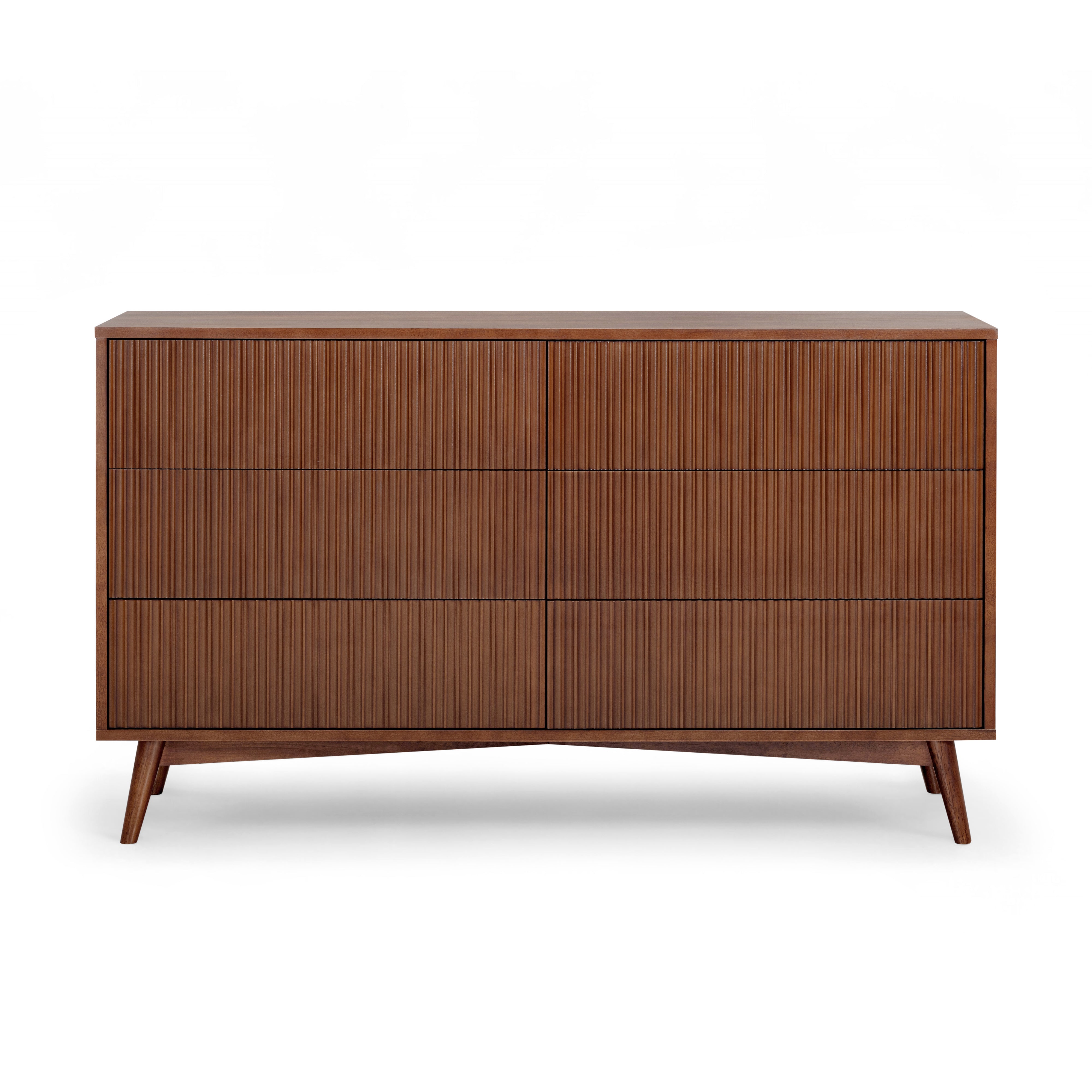 Fluted drawer fronts add texture without visual clutter, and the walnut finish adds warmth and depth. Smooth drawer operation supports regular use, and the top surface offers space for styling or storage. Suitable for bedrooms or guest rooms, this dresser delivers practical capacity with a refined finish.