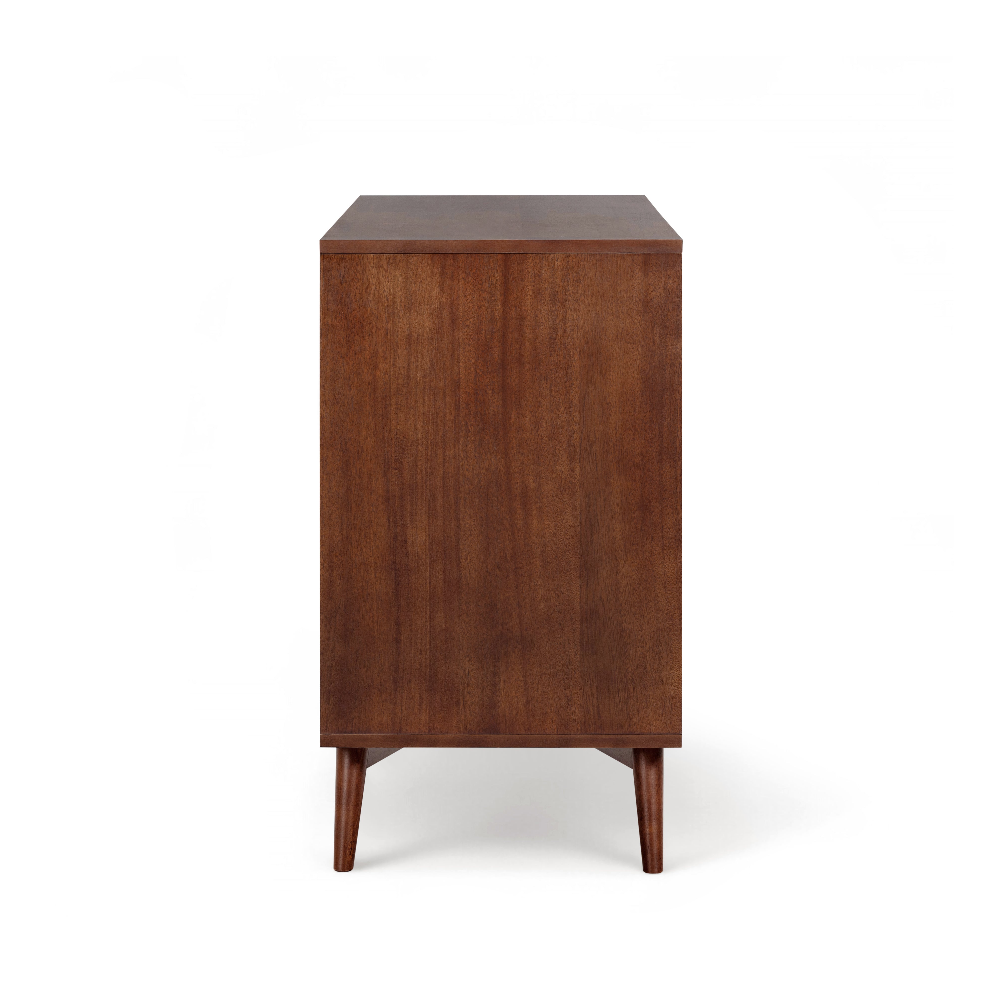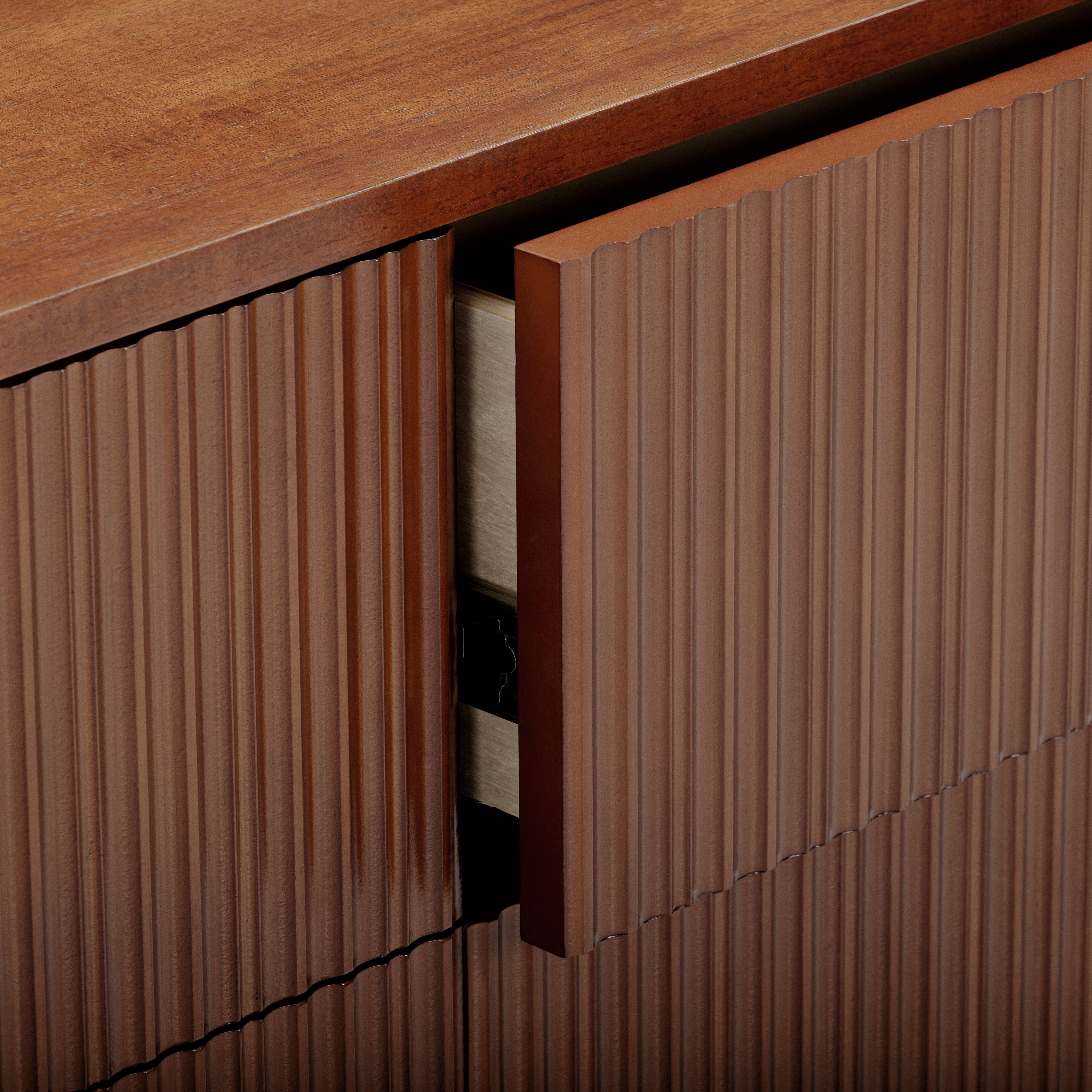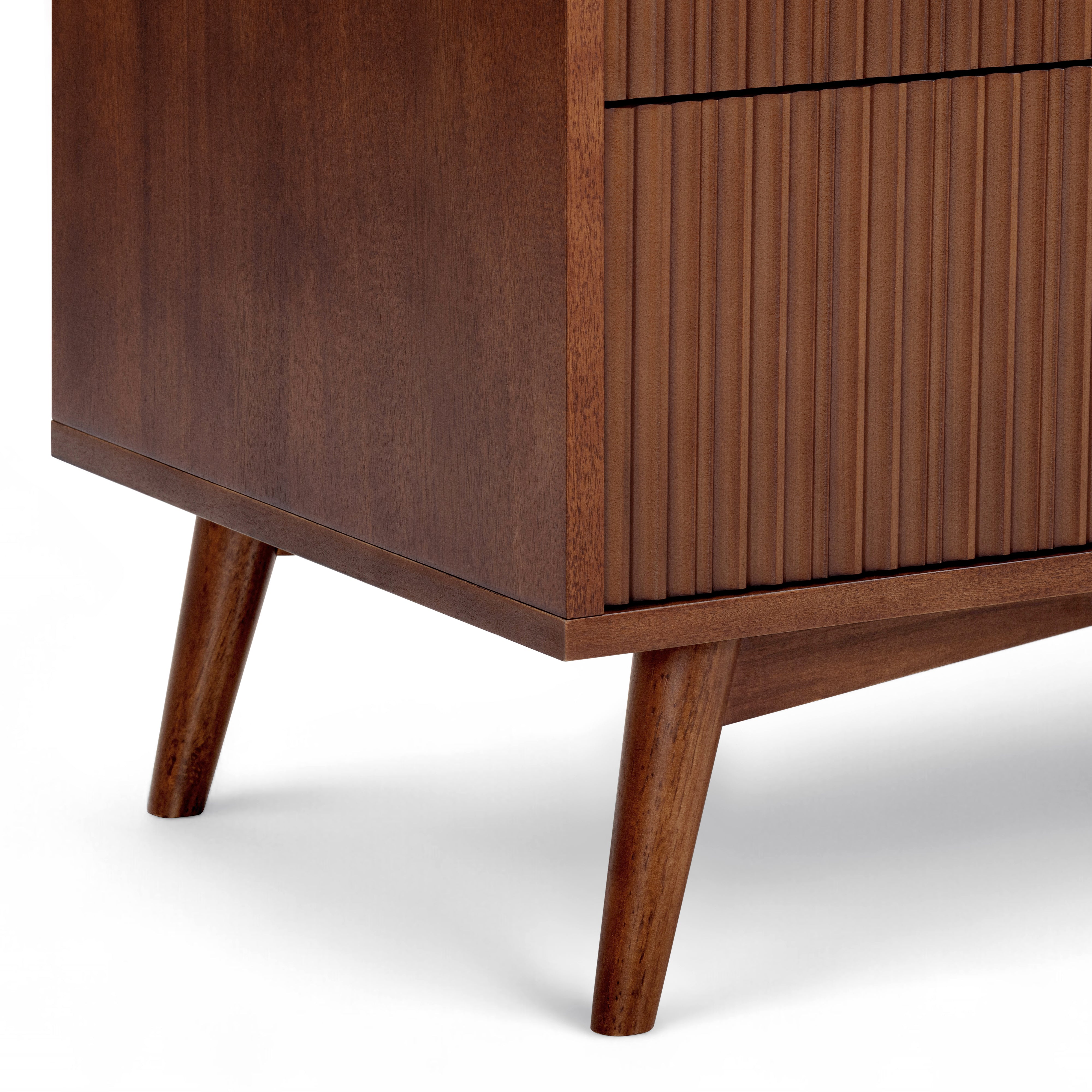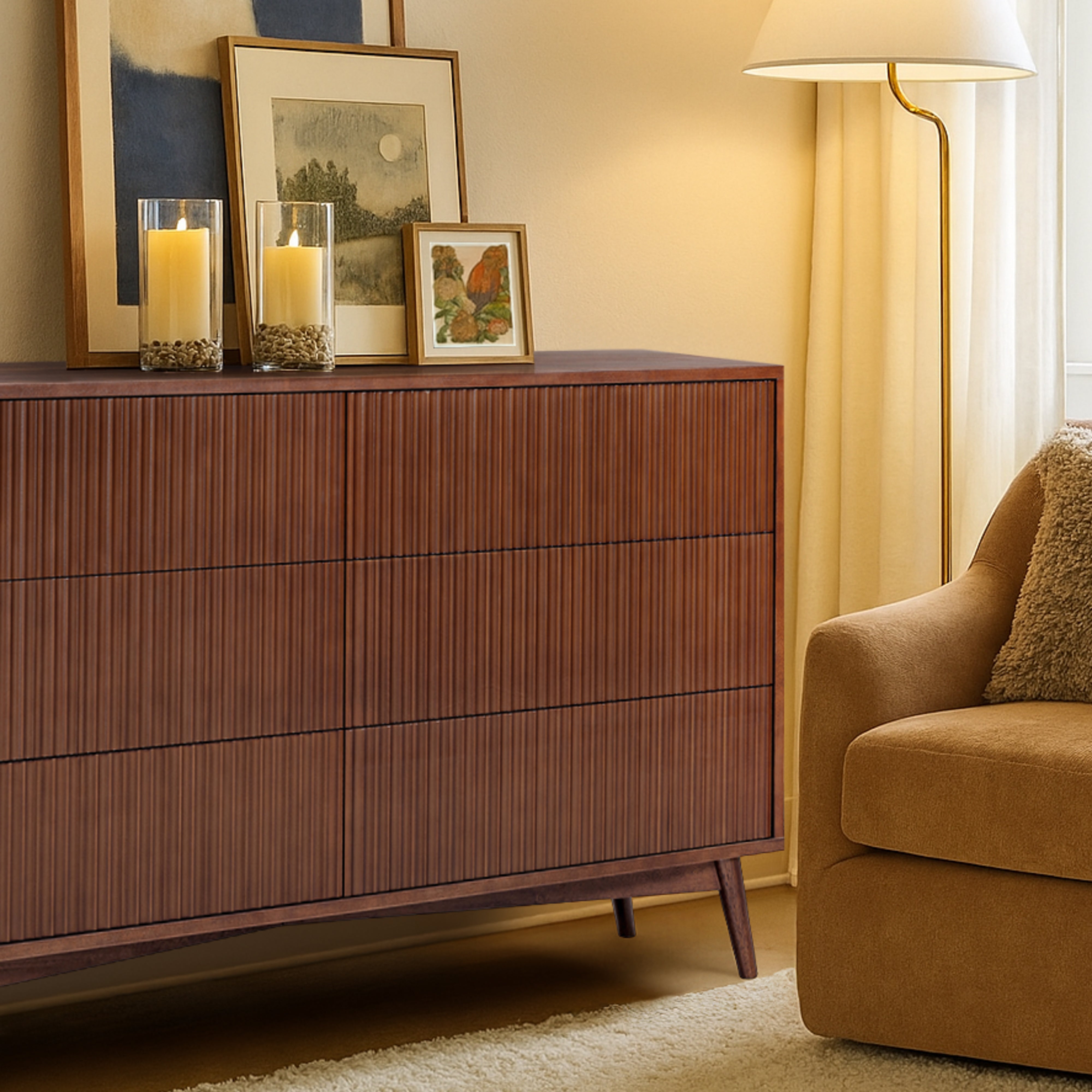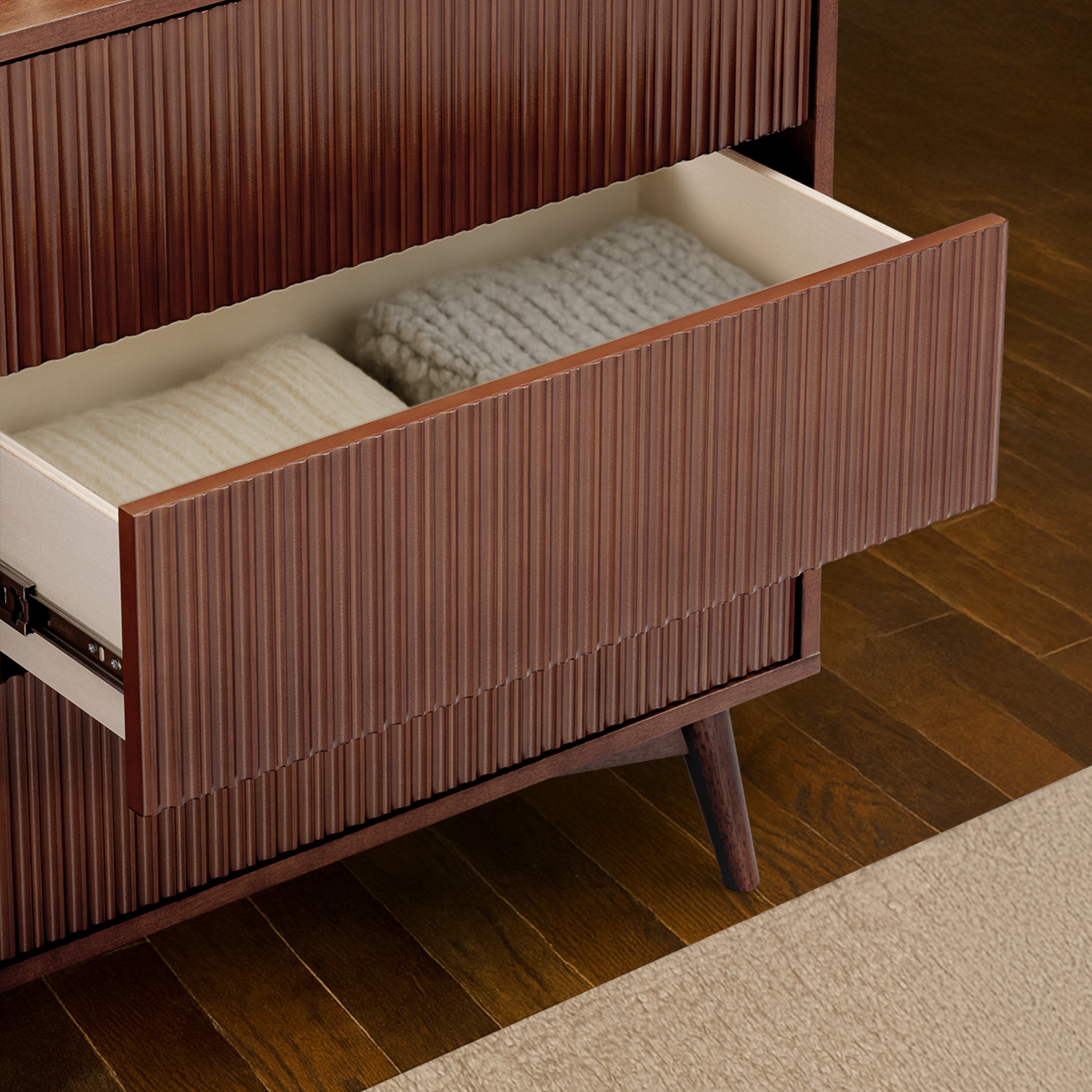 Fluted drawer fronts add texture without visual clutter, and the walnut finish adds warmth and depth. Smooth drawer operation supports regular use, and the top surface offers space for styling or storage. Suitable for bedrooms or guest rooms, this dresser delivers practical capacity with a refined finish.