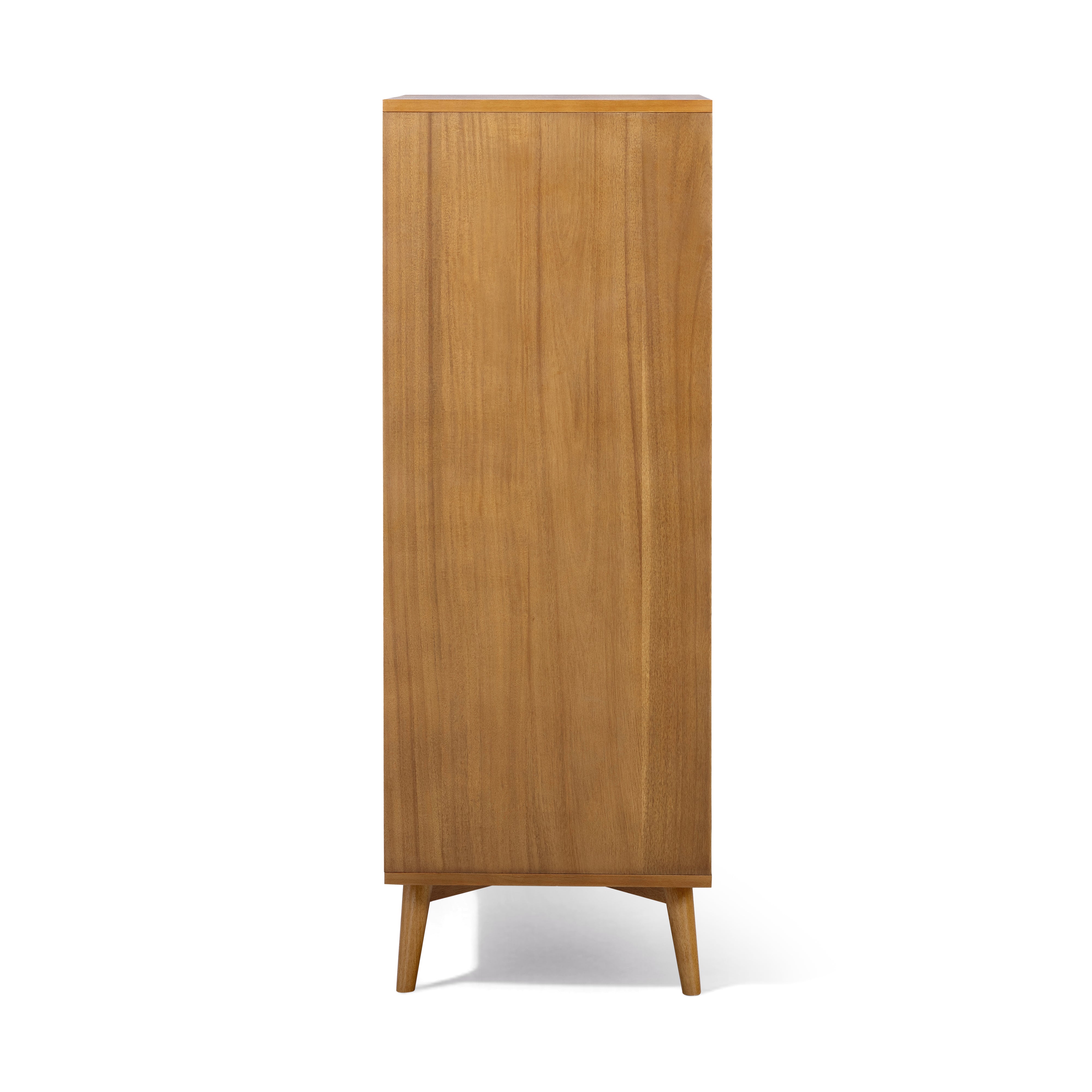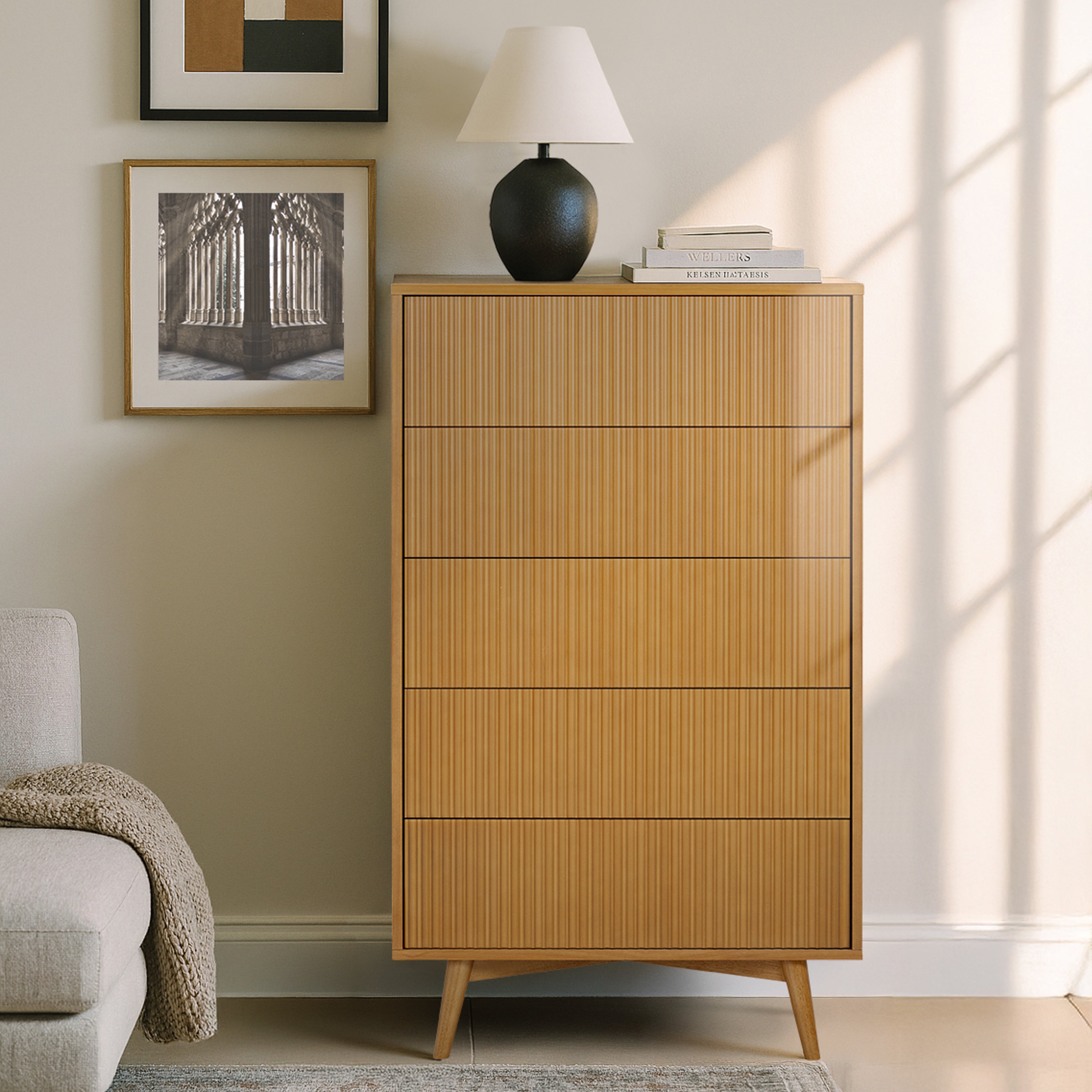 The Teamson Home Tremolo 127 cm tall Dresser is designed to maximise storage while saving floor space. With five deep drawers arranged vertically, it offers efficient organisation for clothing and accessories in bedrooms where space is limited. Constructed from engineered wood panels wrapped in acacia veneer with solid wood structural support, the dresser delivers stability and durability. Fluted drawer fronts add subtle texture, and the natural finish creates a calm, modern look. Smooth drawer movement supports everyday use, while the top surface provides additional display space. This tall dresser is ideal for creating organised storage without overwhelming the room.