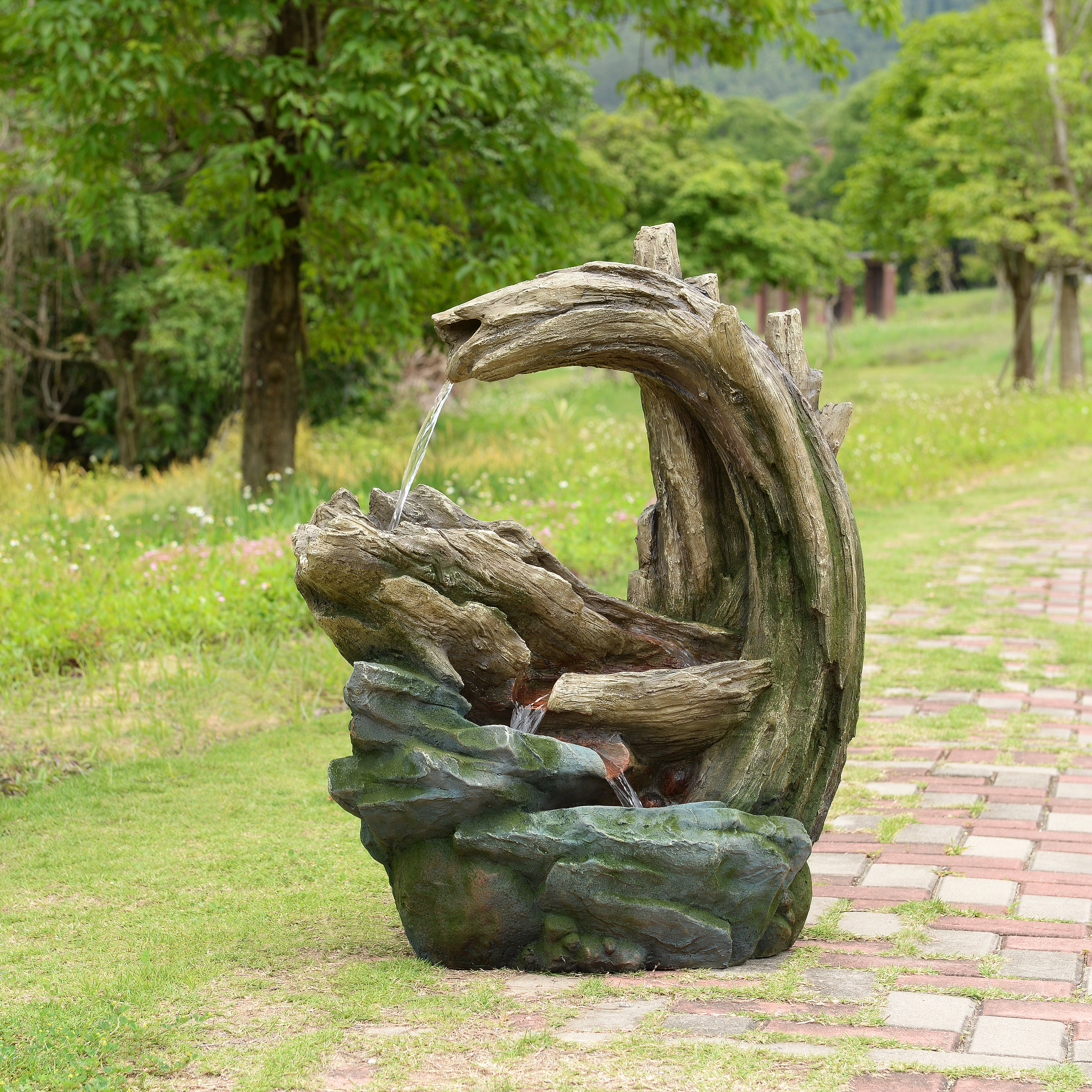 Bring the gentle rhythm of nature into your outdoor space with the Teamson Home 82 cm tall Cascading Faux Rock and Wood Fountain. Designed to echo the look and sound of a forest stream, this decorative water feature transforms patios, gardens and terraces into calm, inviting retreats. Water flows smoothly through curved tiers, creating a continuous cascade that delivers soothing sound while adding visual movement.