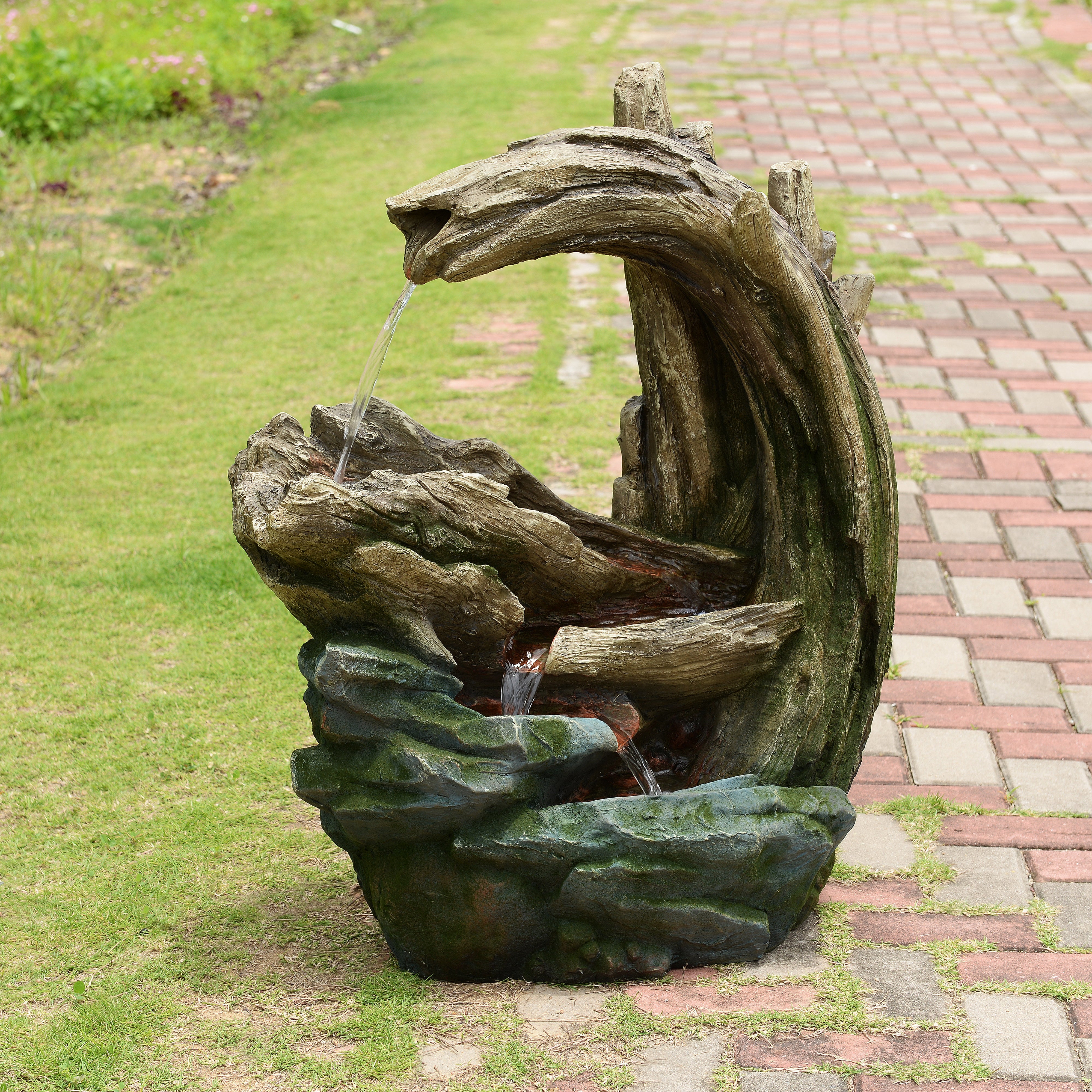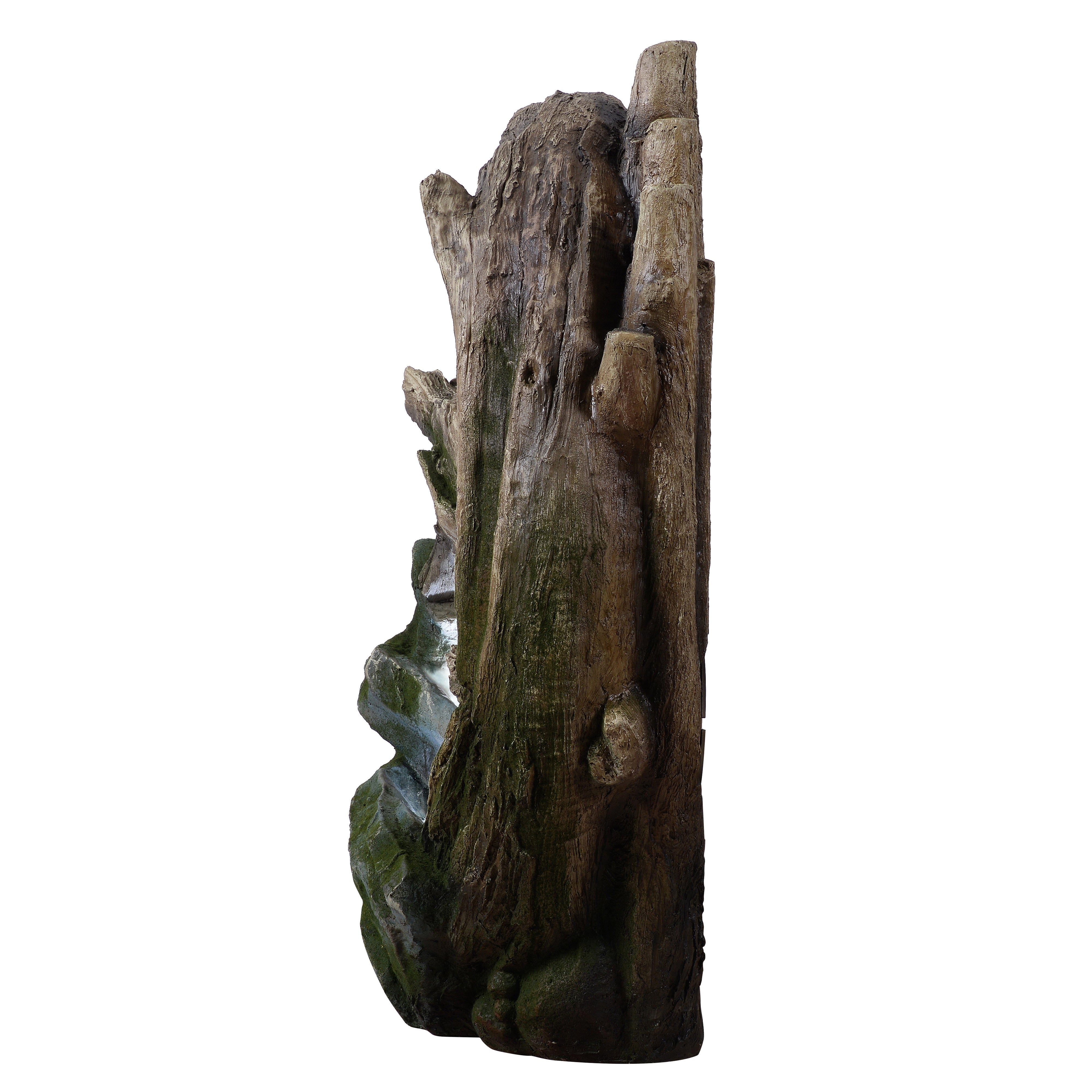 Integrated LED lights illuminate the flowing water, producing a warm glow that enhances evening ambience without overpowering the natural design. Crafted from durable polyresin, stone powder and fibreglass, the fountain captures the texture and detail of real rock and driftwood while remaining lightweight and weather-resistant. This construction ensures long-lasting outdoor performance while allowing easy positioning wherever you want to create a relaxing focal point. Installation is straightforward. Place the fountain on a stable, level surface, connect the pump and LED cables, fill the basin with clean water until the pump is fully submerged and plug into a GFCI-protected outdoor socket.