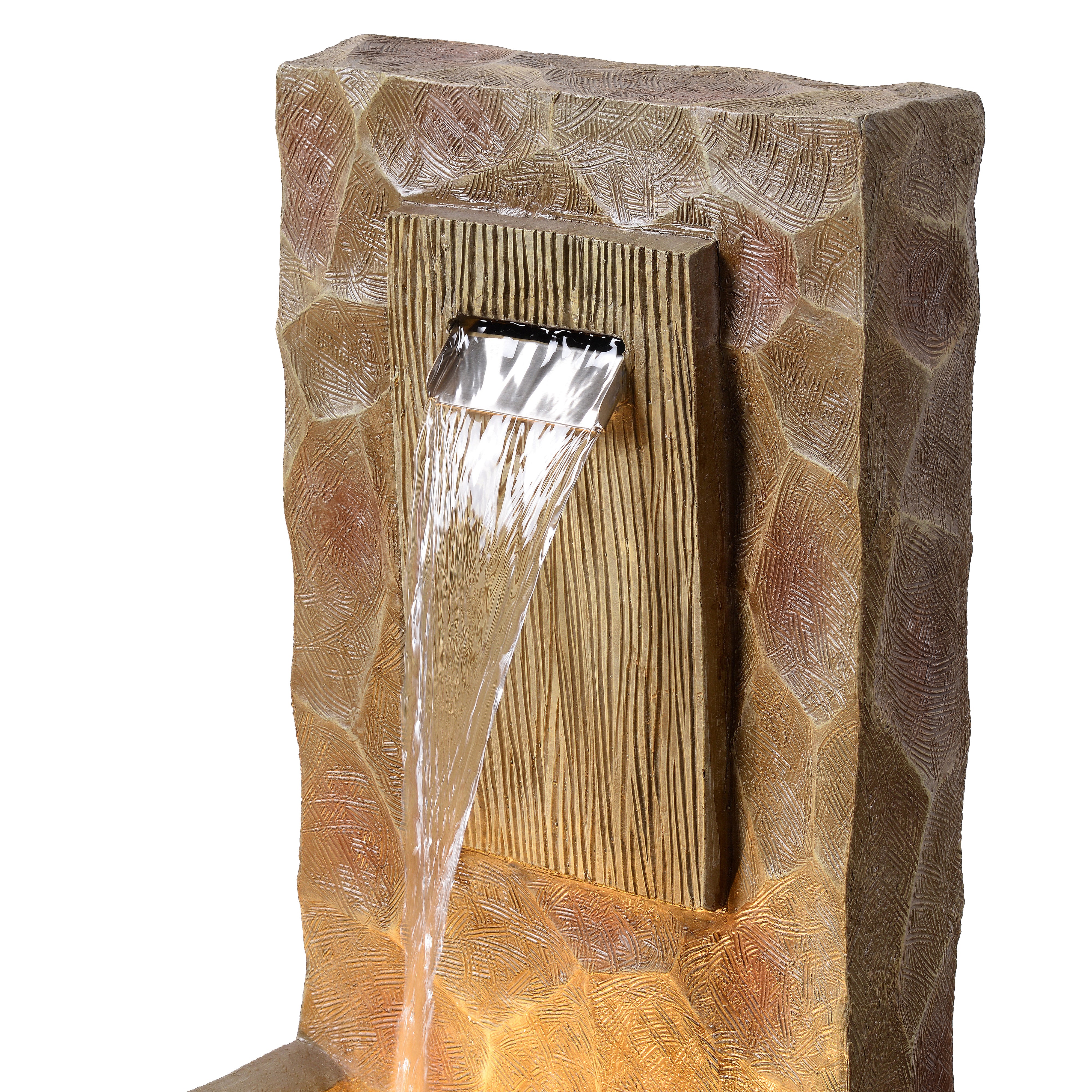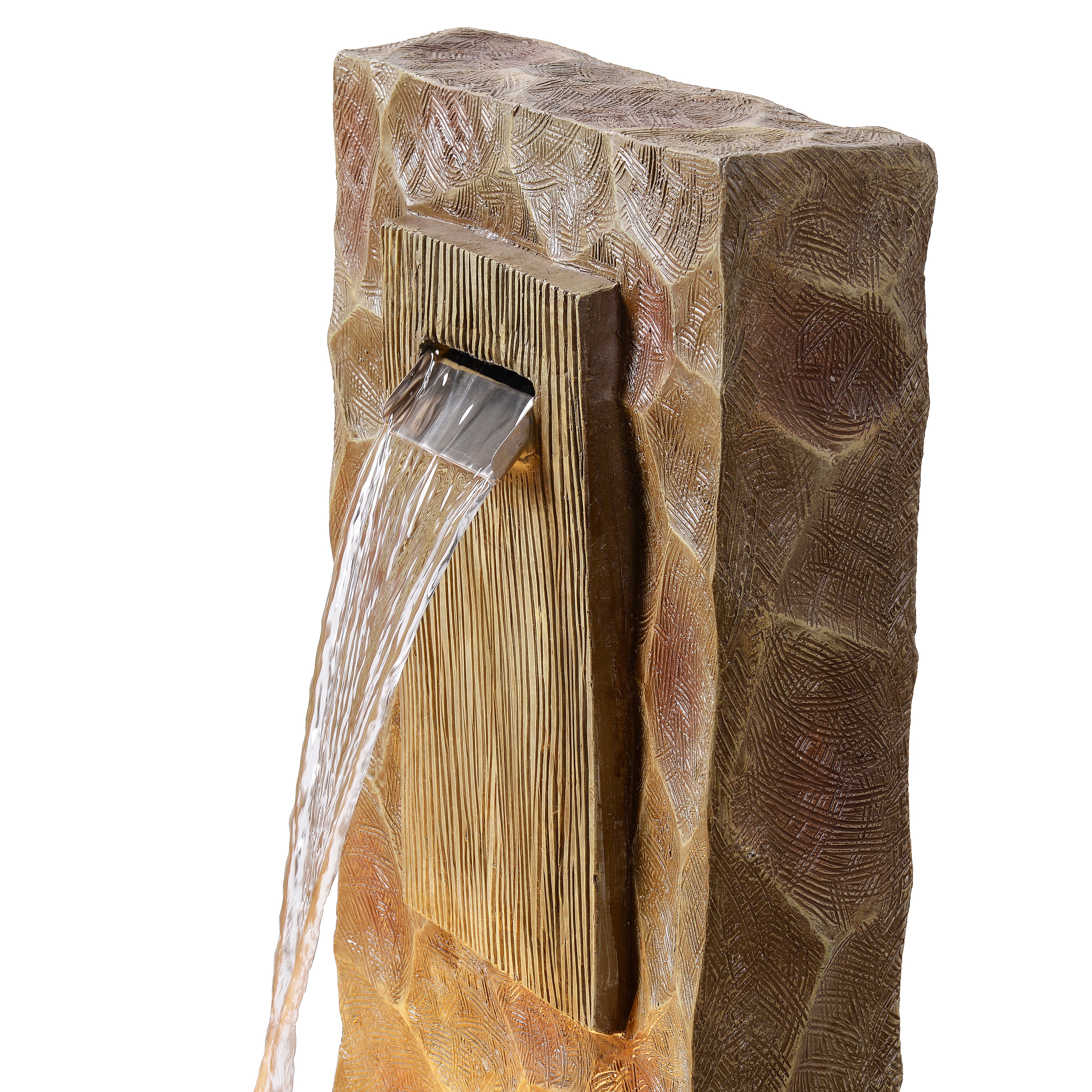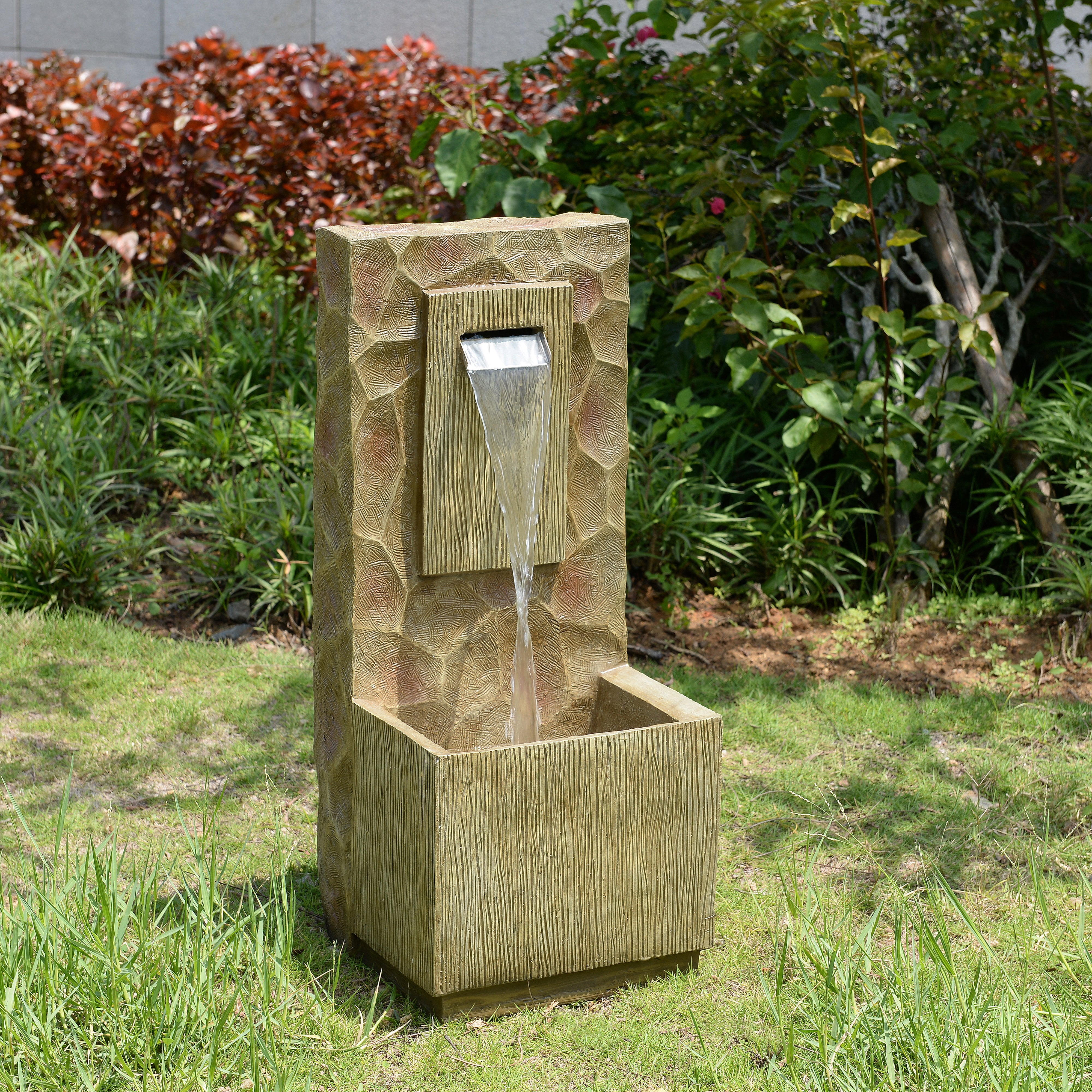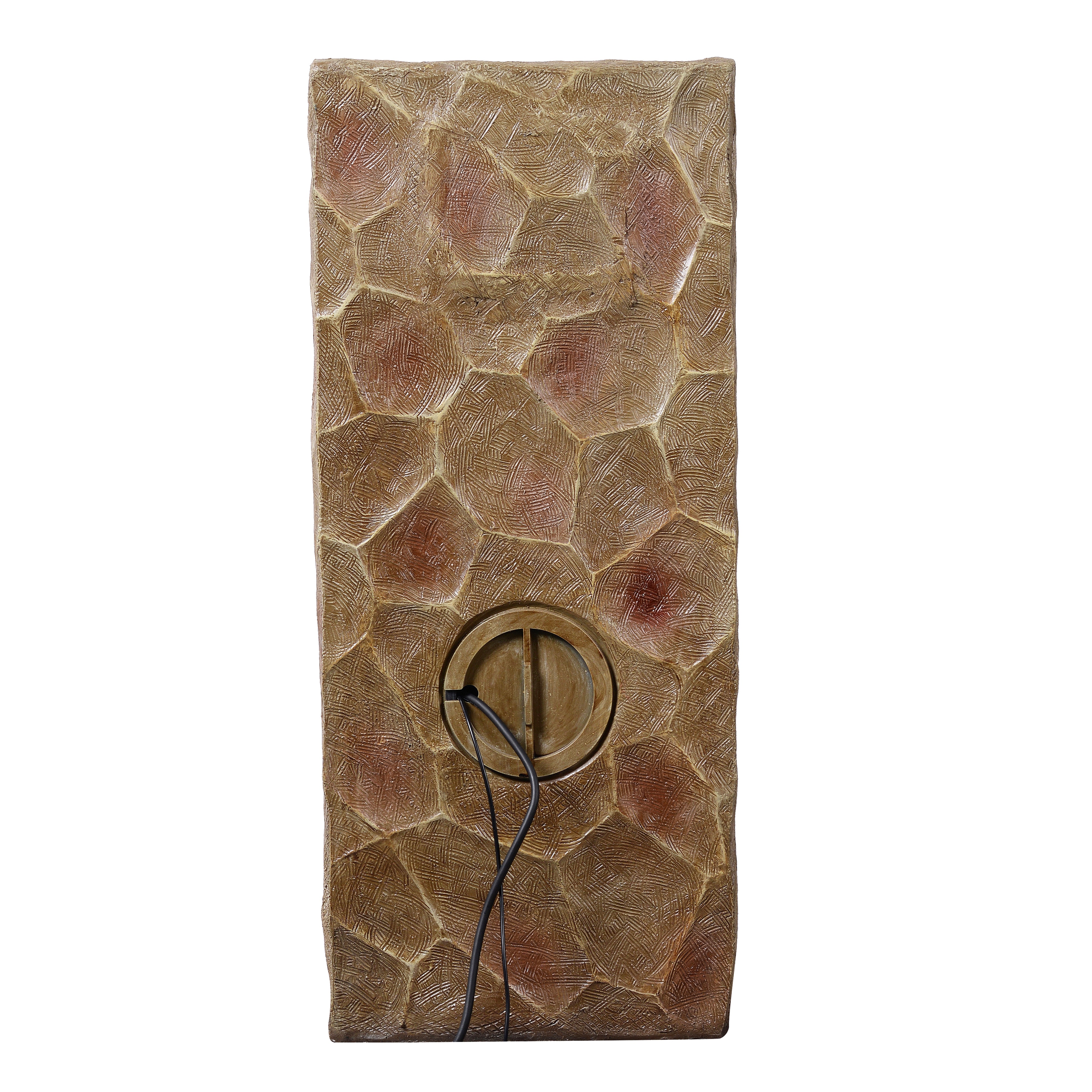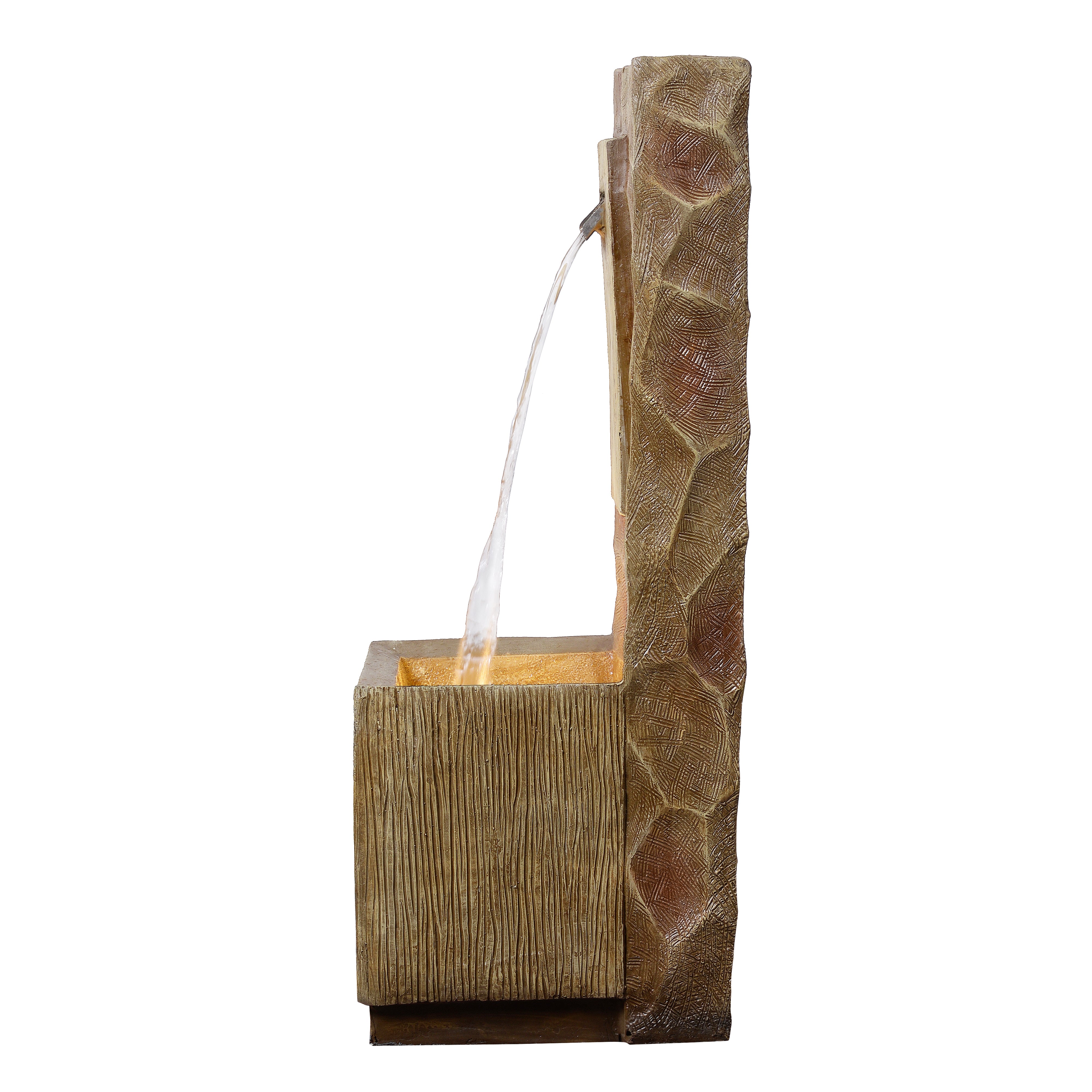 Crafted from durable stone powder and fiberglass, the fountain offers the look of natural stone with weather-resistant performance suitable for outdoor conditions. The brown stone-effect finish complements greenery and outdoor décor.