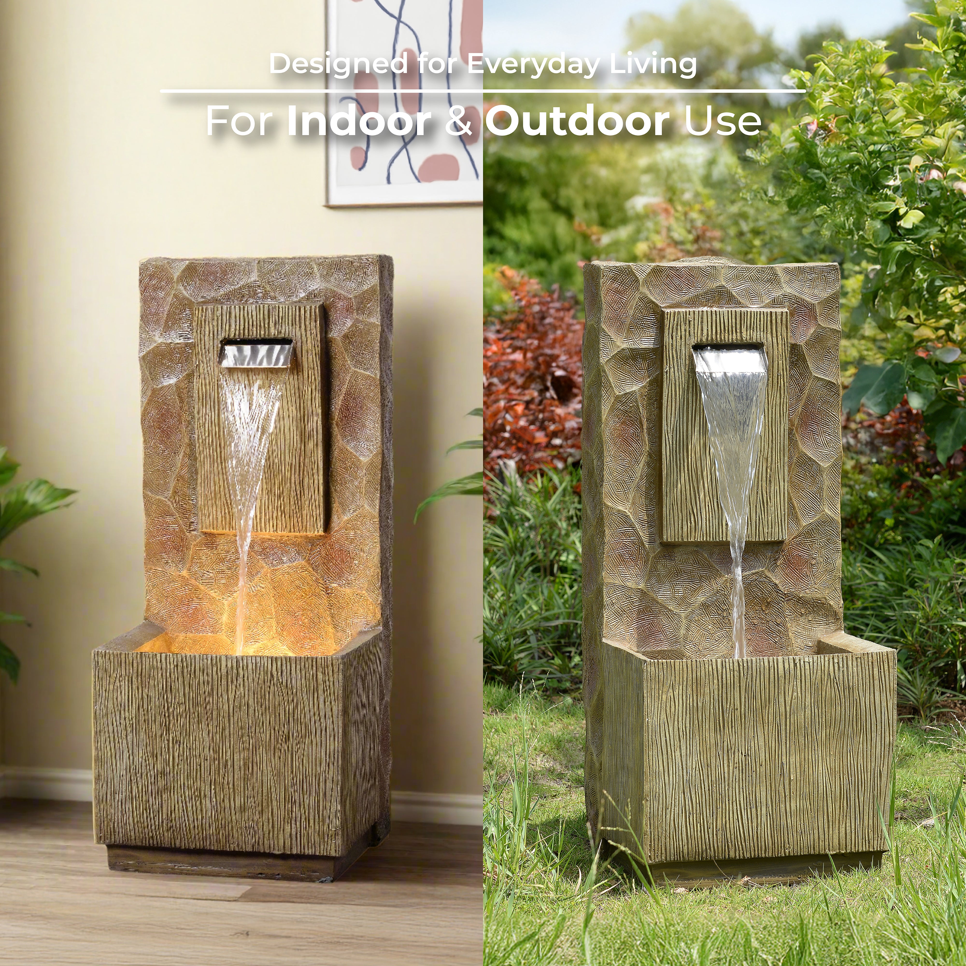 The Teamson Home 81 cm tall Waterfall Outdoor Fountain with LED Lights is designed to enhance outdoor living through sound, light and movement. Water cascades evenly down the vertical surface, producing a soothing flow that encourages relaxation while masking background noise. Integrated LED lighting softly illuminates the water, creating an inviting atmosphere during evening hours.