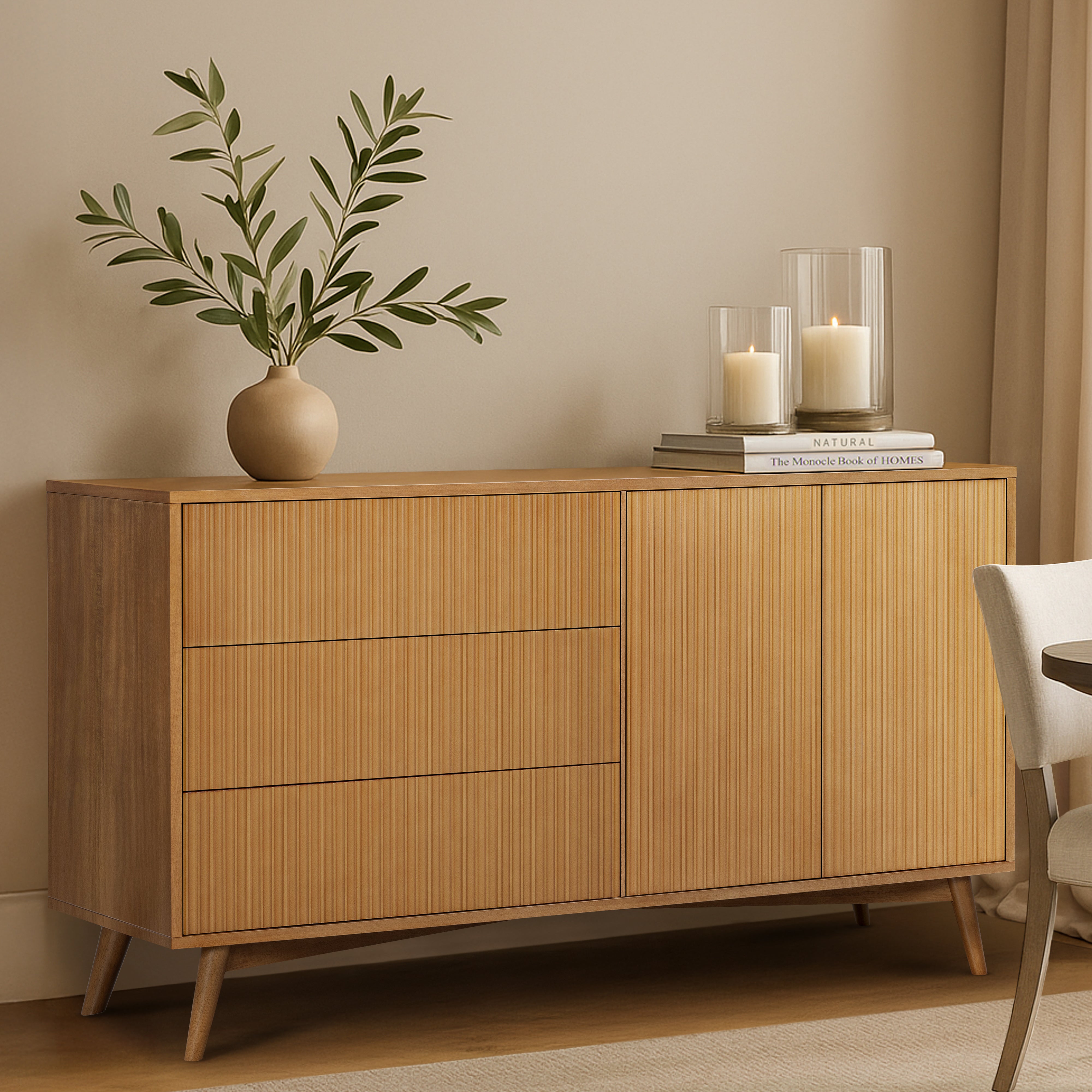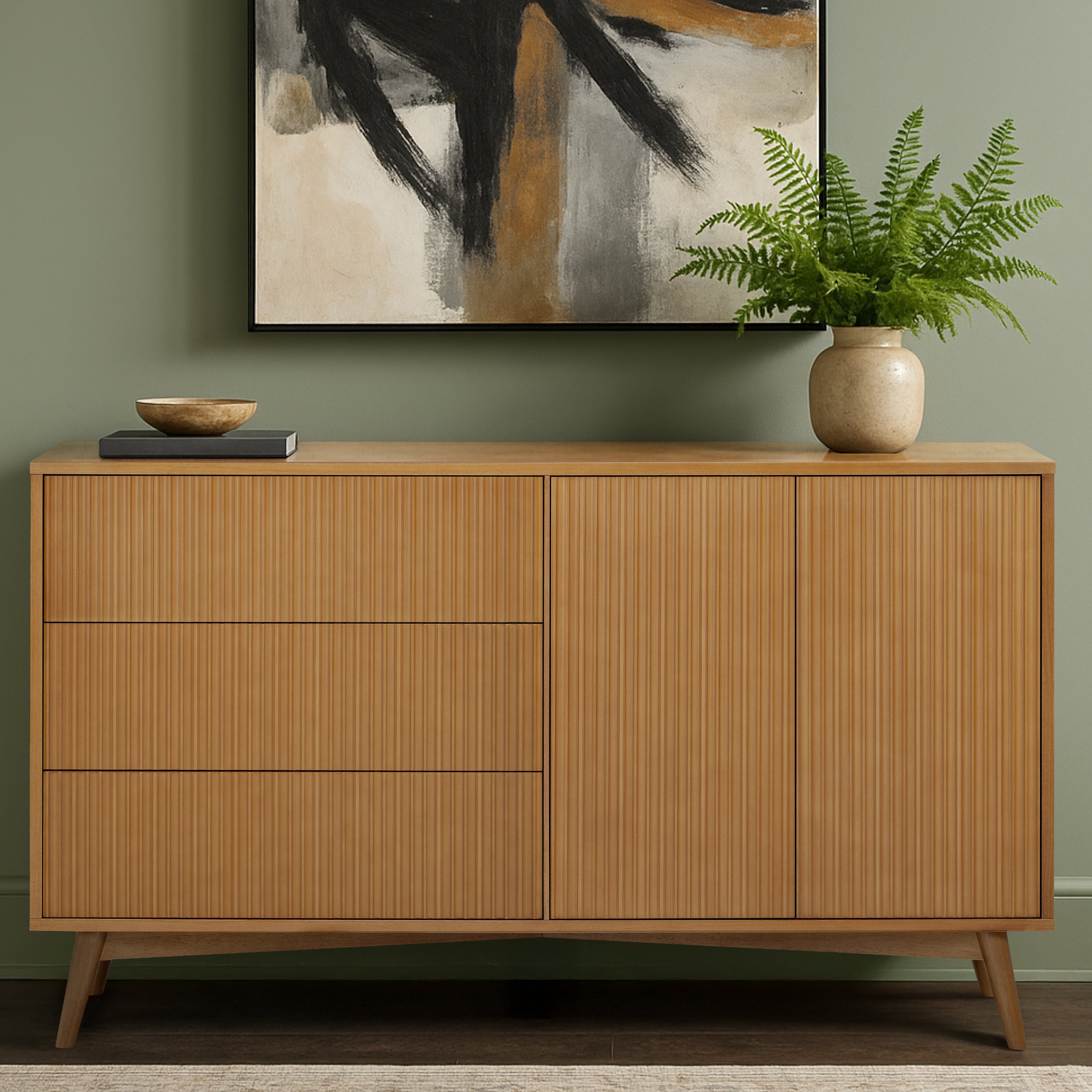 The Teamson Home Tremolo 140 cm wide Sideboard is built to combine everyday storage with refined design. Featuring three drawers and a two-door cupboard with adjustable shelving, it offers flexible organisation for dining, living or hallway spaces. Fluted front detailing adds depth and texture, while the natural wood-effect finish brings warmth without overpowering the room.