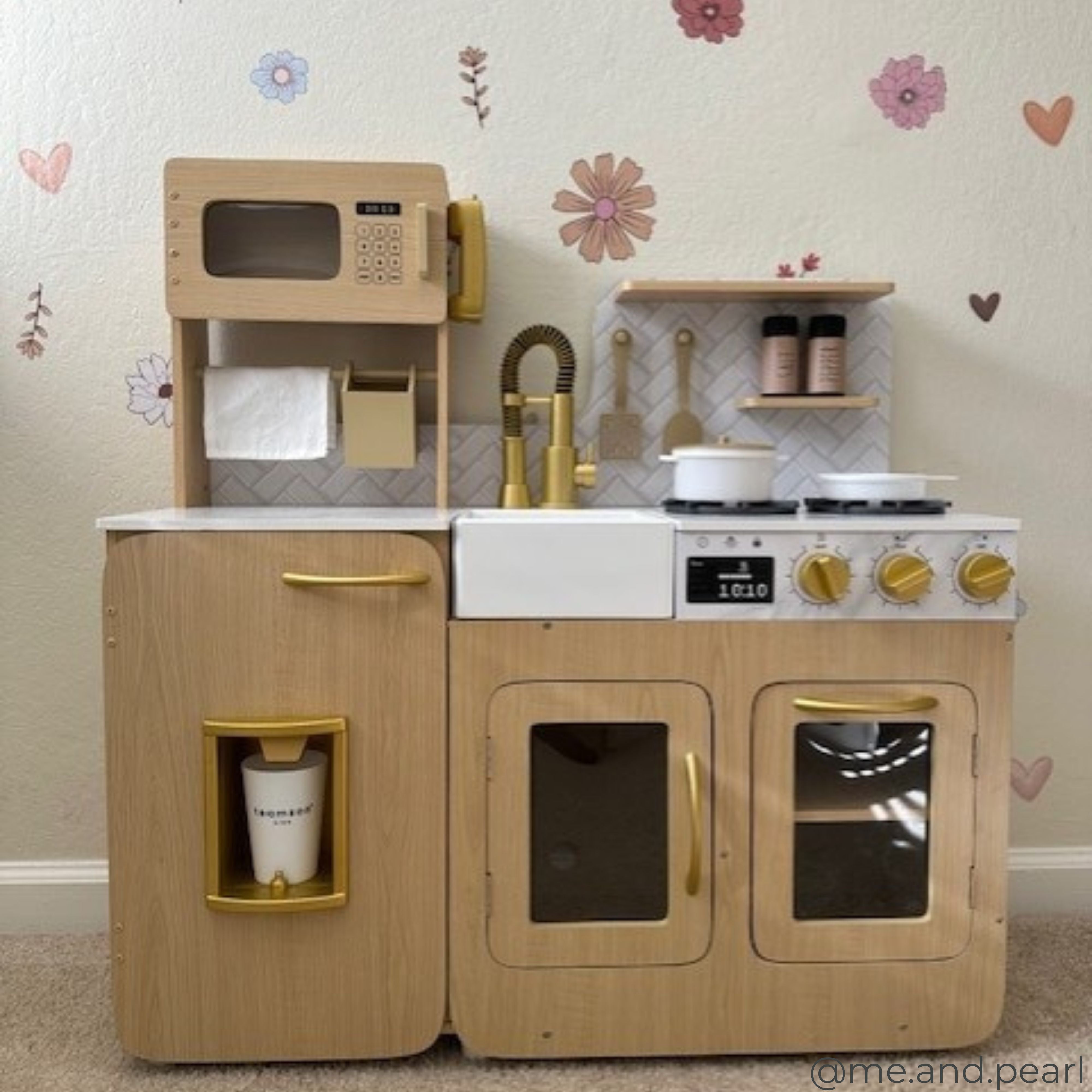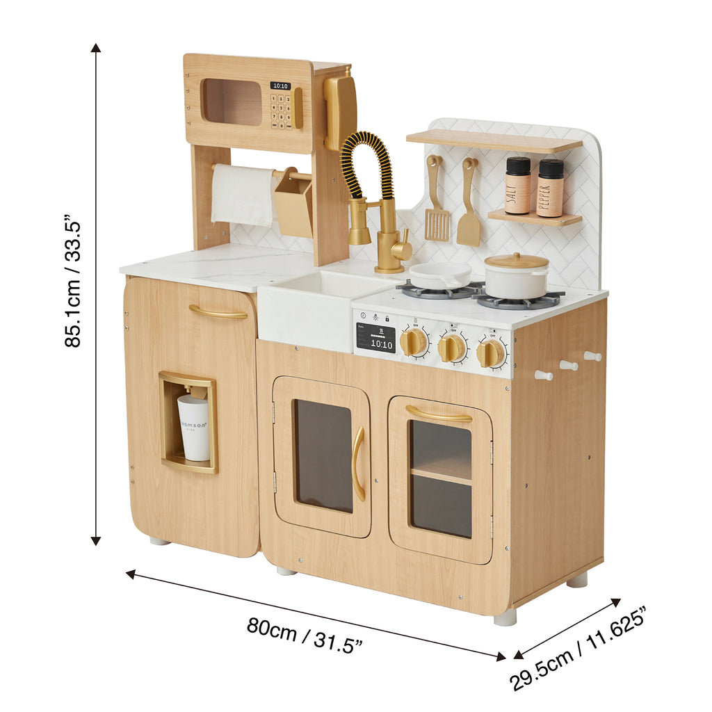 Whether they’re flipping pretend pancakes or pouring “ice” into a cup, your child will love the realistic touches: a pull-down sprayer, built-in ice maker, clicking oven knobs, and a sleek faux marble countertop. Styled with a light oak finish, white backsplash, and gold accents, this wooden kitchen for toddlers looks just like a grown-up kitchen—but perfectly sized for little hands. It’s ideal for pre-schoolers learning through play and makes a smart, lasting choice for families seeking a wood kitchen playset that’s both beautiful and built to last.