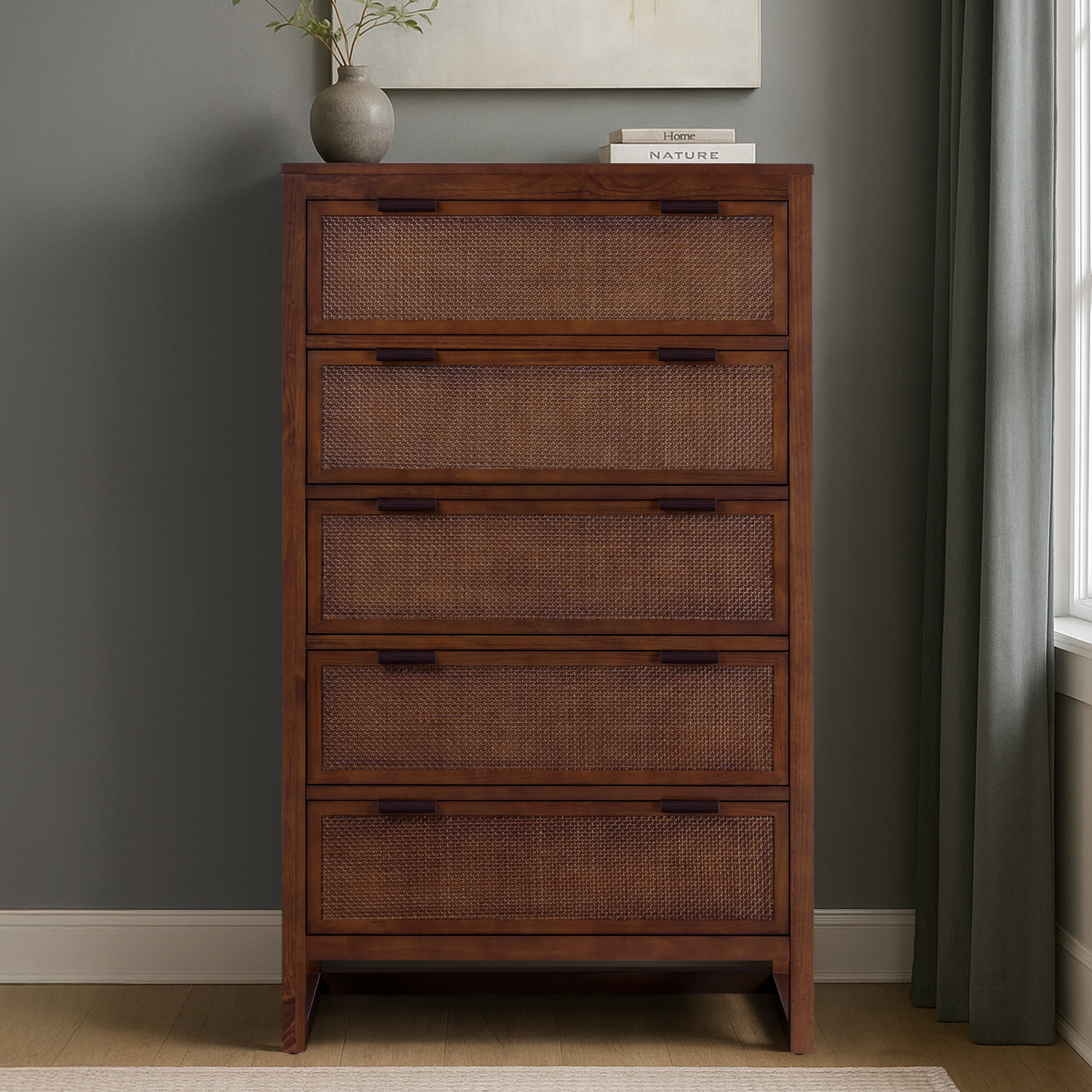 Rattan inset drawer fronts add visual interest, while the walnut finish provides warmth and depth. Five spacious drawers support organised storage without overcrowding the room. The smooth drawer mechanism allows for comfortable daily use, and the top surface can be styled as needed. The included anti-tip kit enhances safety, and assembly is designed to be clear and efficient. Ideal for bedrooms where space is limited, this dresser delivers functional storage with a refined finish.