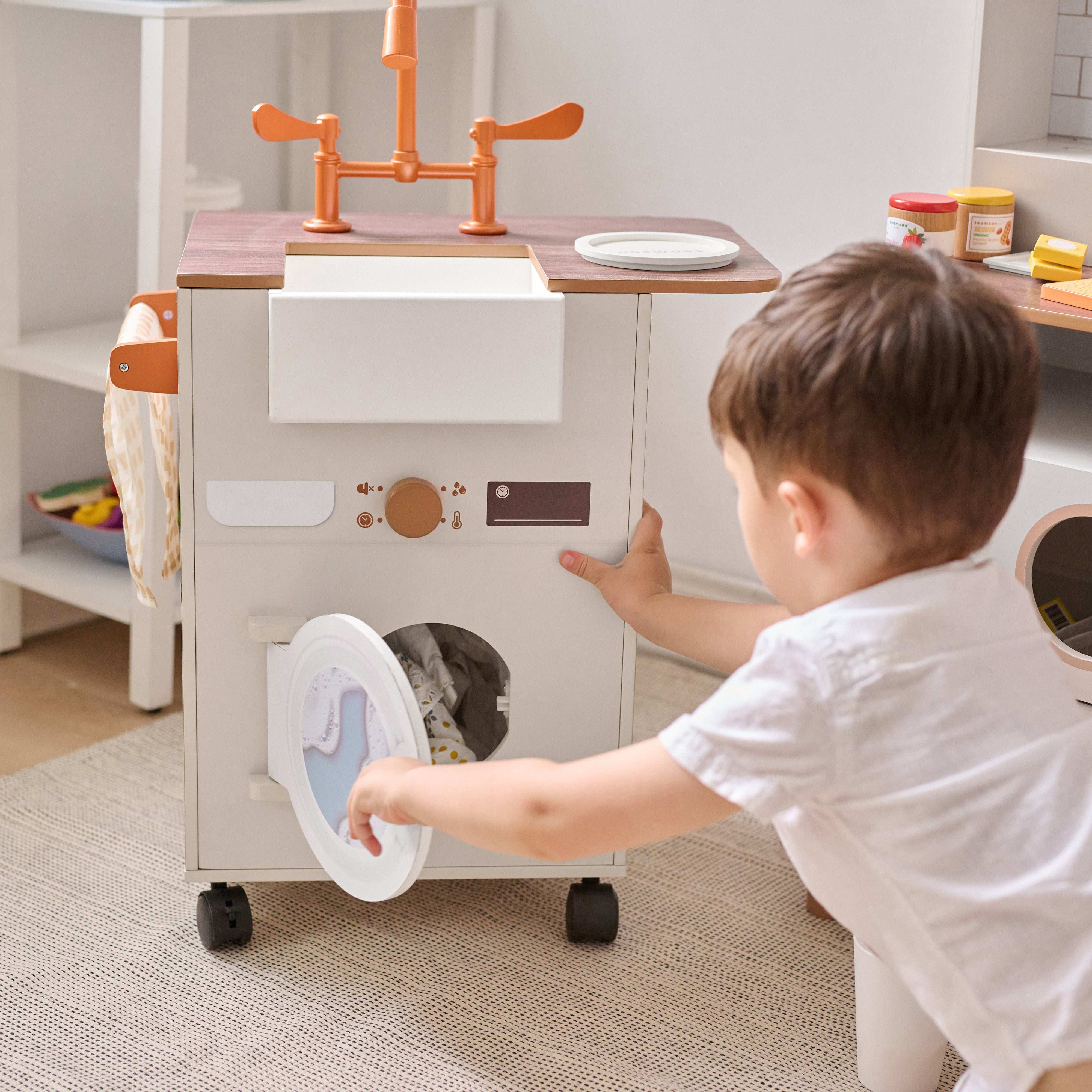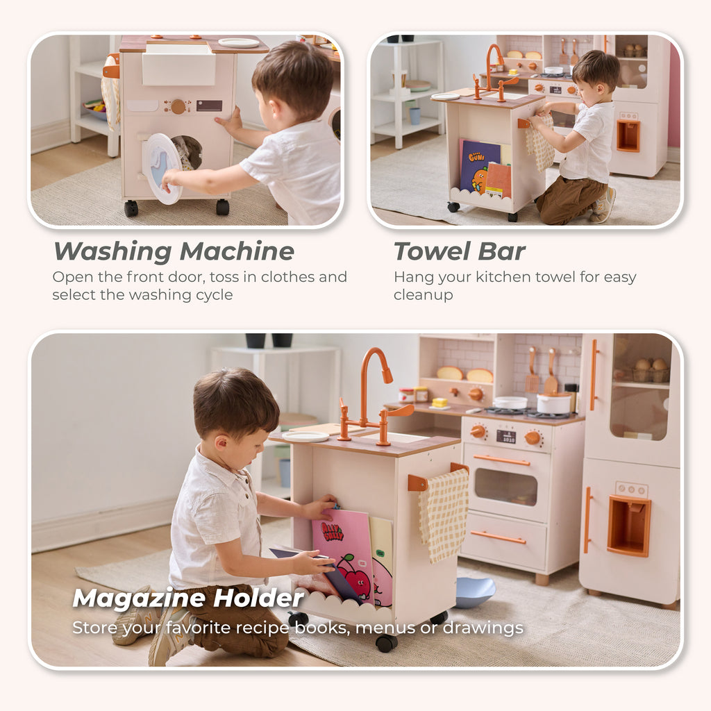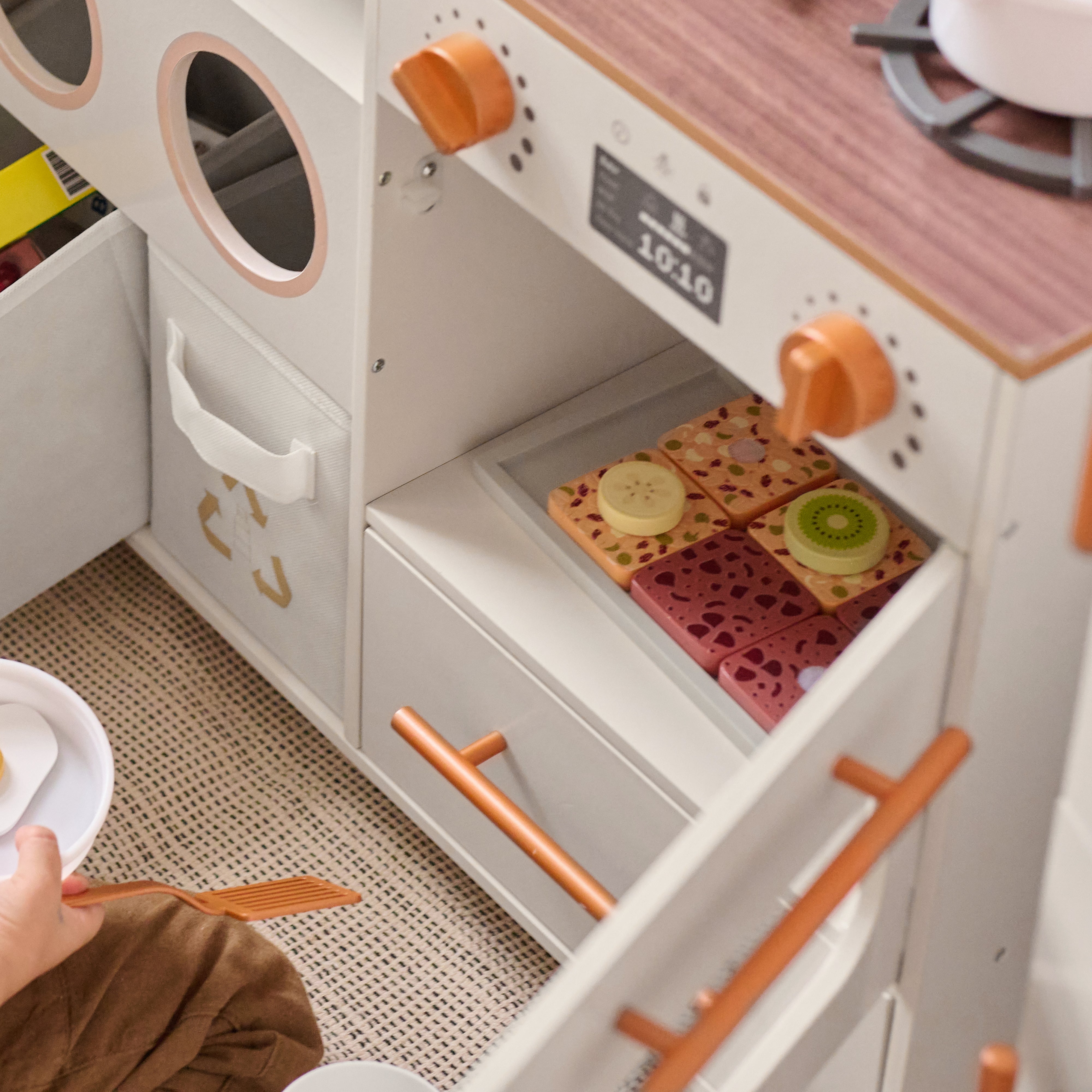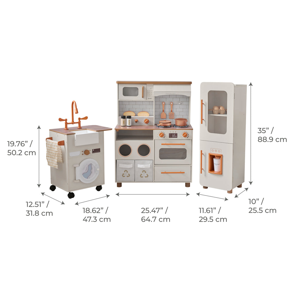 The set includes a fridge-freezer, a combination sink-and-laundry unit, and a cooking station with realistic burners, turning knobs, and clicking sounds. Each piece features built-in storage and interactive details like an ice-maker that drops pretend cubes and a washer door that opens for imaginative play. Crafted from durable MDF with safe, smooth edges and eco-friendly finishes, the set includes 21 kitchen accessories—pots, pans, utensils, egg carton, salt and pepper shakers, toast, towel, storage bins and more.