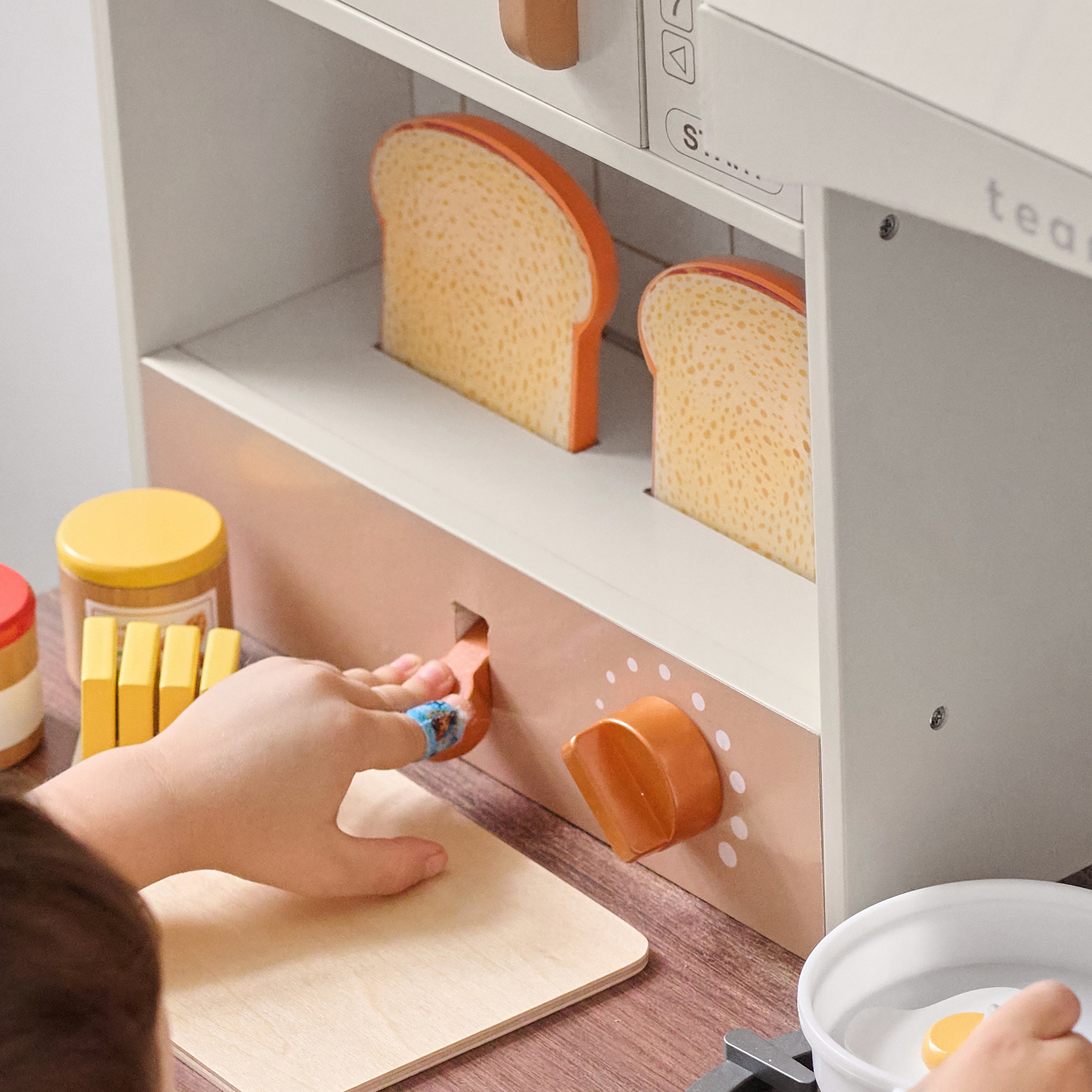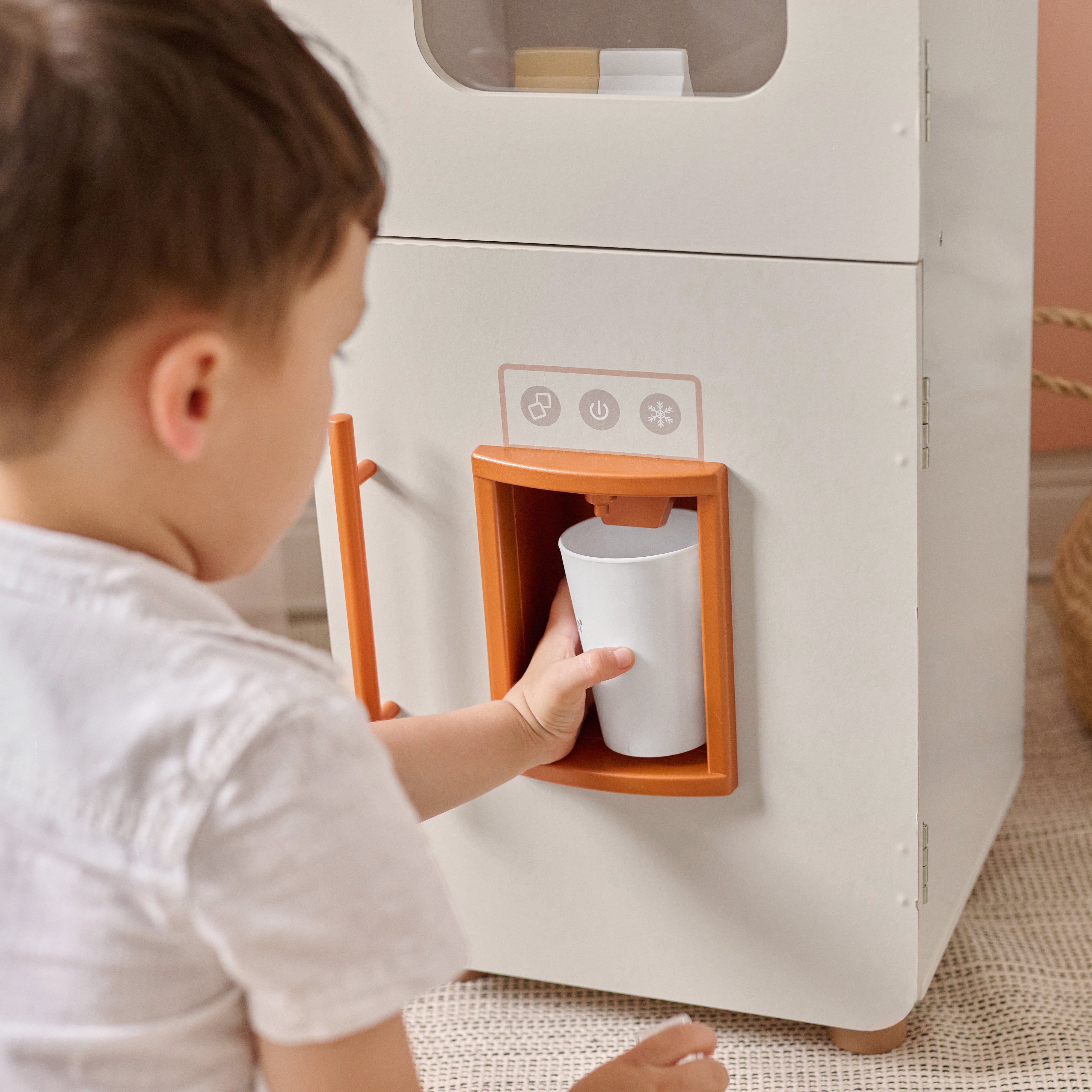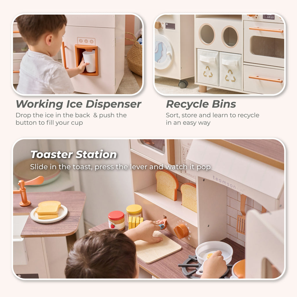 The set includes a fridge-freezer, a combination sink-and-laundry unit, and a cooking station with realistic burners, turning knobs, and clicking sounds. Each piece features built-in storage and interactive details like an ice-maker that drops pretend cubes and a washer door that opens for imaginative play. Crafted from durable MDF with safe, smooth edges and eco-friendly finishes, the set includes 21 kitchen accessories—pots, pans, utensils, egg carton, salt and pepper shakers, toast, towel, storage bins and more.